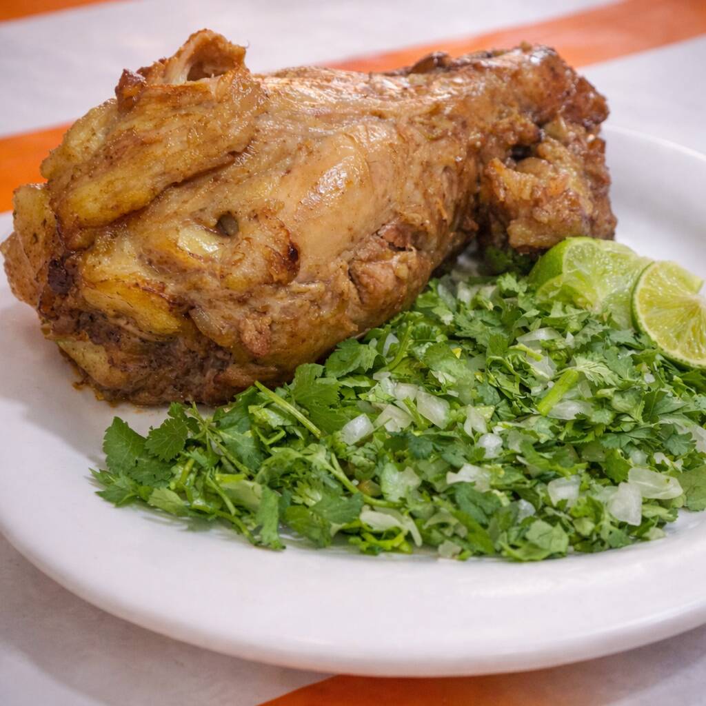 Chamorro de carnitas, acompañado de cebolla desflemada y chiles habaneros, cebolla, cilantro, limones y salsa