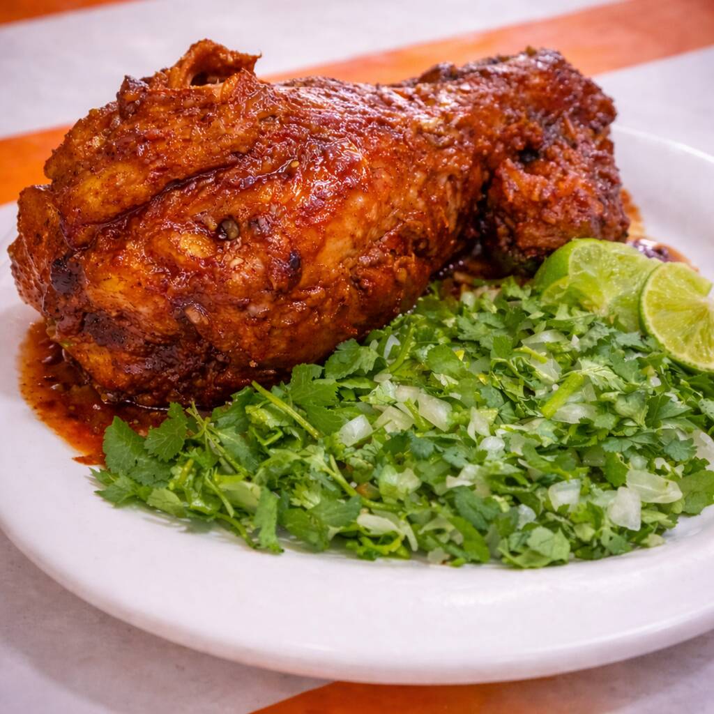 Chamorro en adobo especial, acompañado de nopales, cebolla, cilantro, limones y salsa.