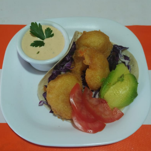 camaron rebosado con tortilla de arina o maiz (opcion a elejir) acompañado con aguacate, jitomate, repollo morado y dip de chipotle