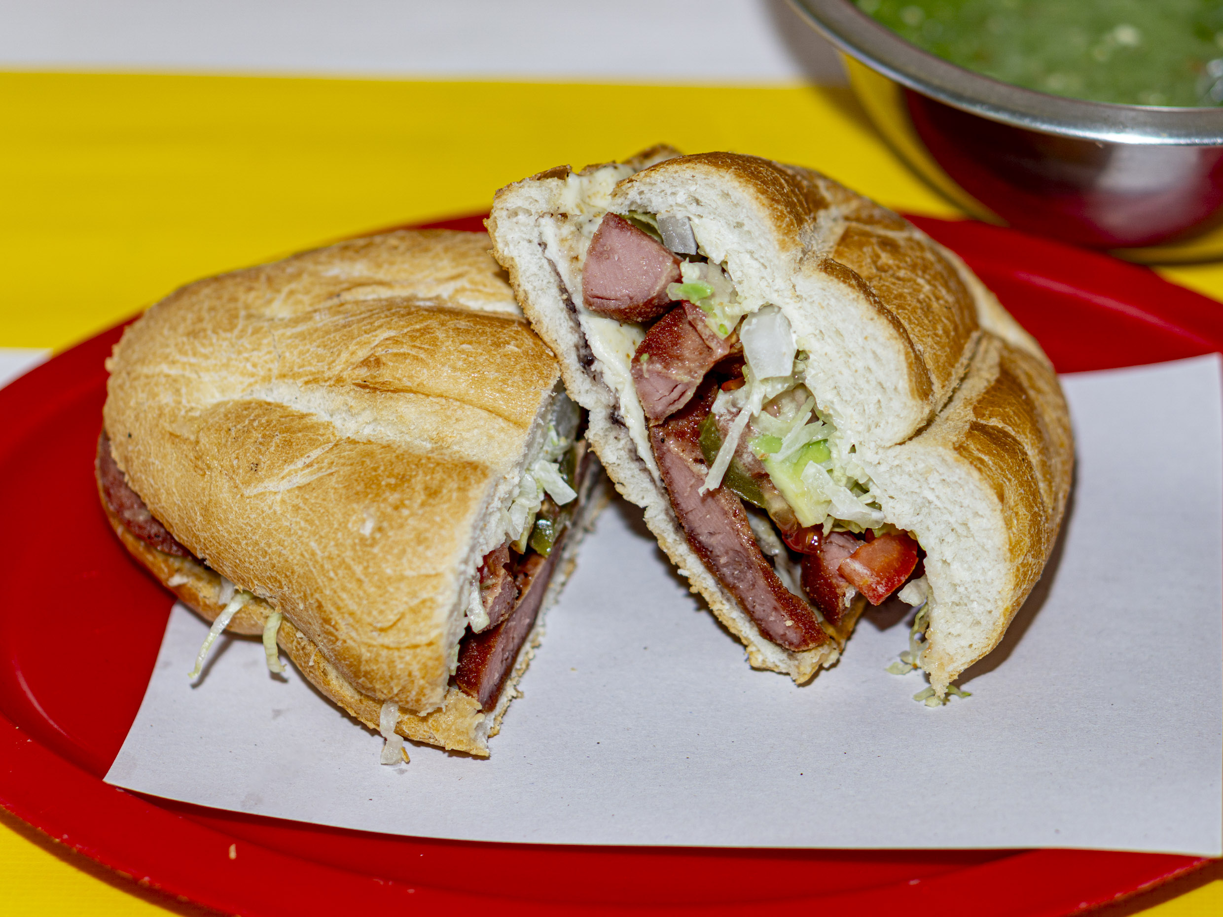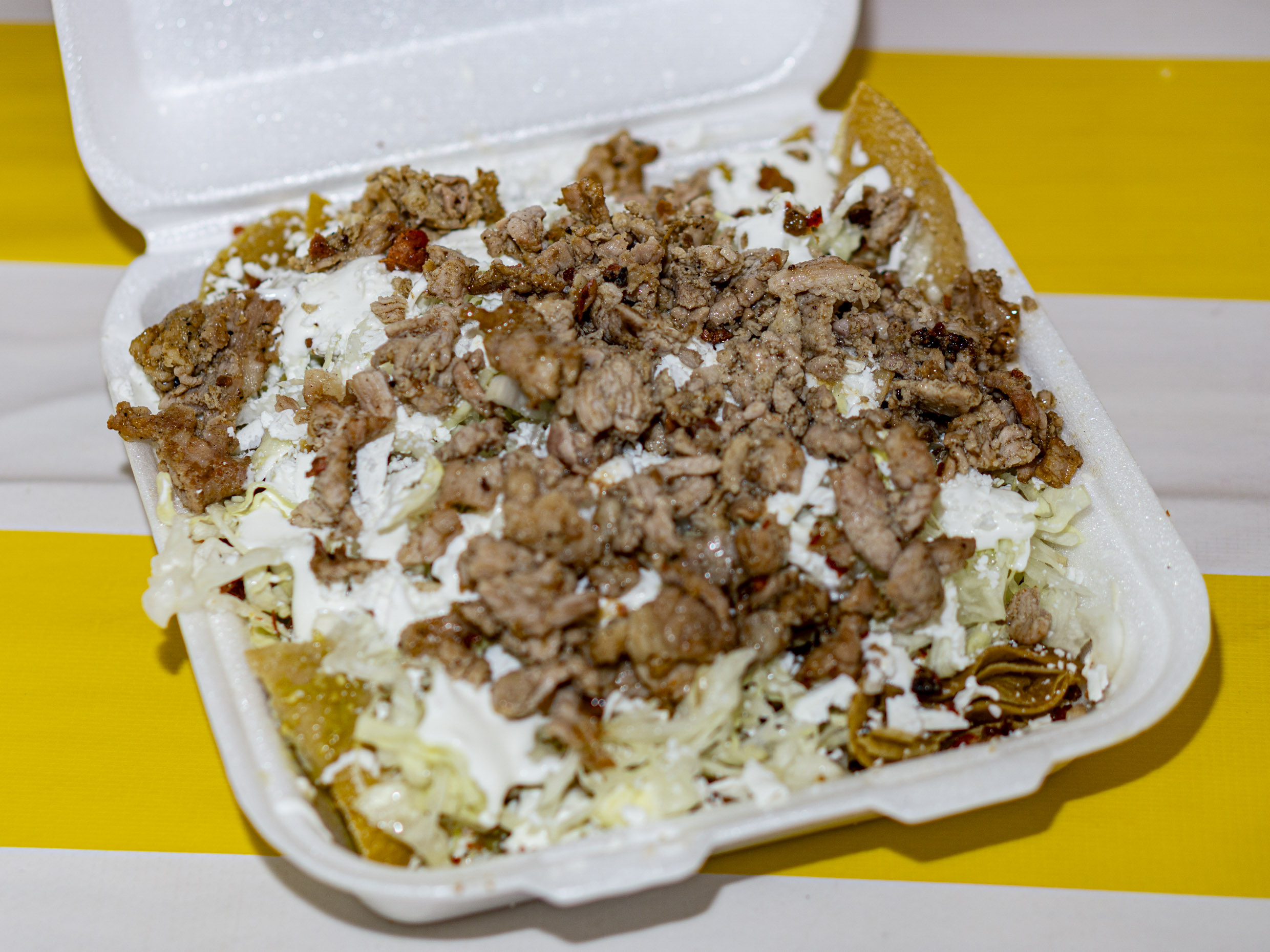 Longaniza, bistec marinado, queso oaxaca, papas fritas, cebolla, frijoles