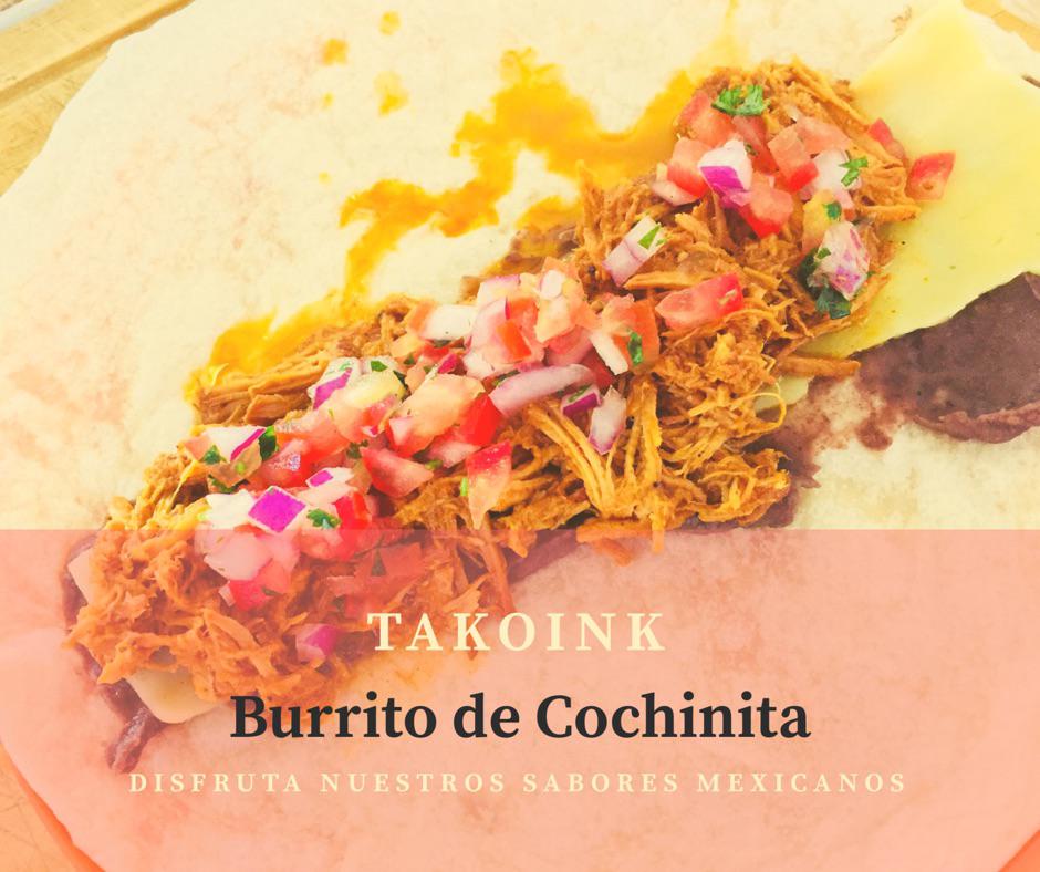 Burrito de cochinita , tortilla de harina, frijoles queso Gouda verdura pico de gallo y salsa habanero