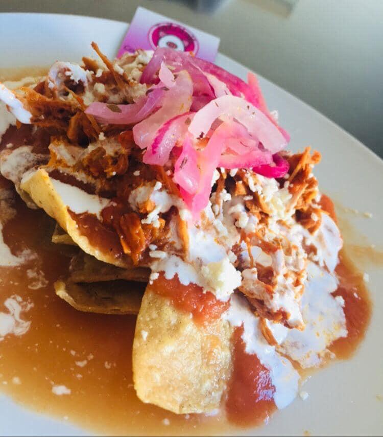 Deliciosos totopos crujientes bañados en salsa roja con ligero toque de habanero, acompañados con Cochinita Pibil, queso, crema y cebolla morada.