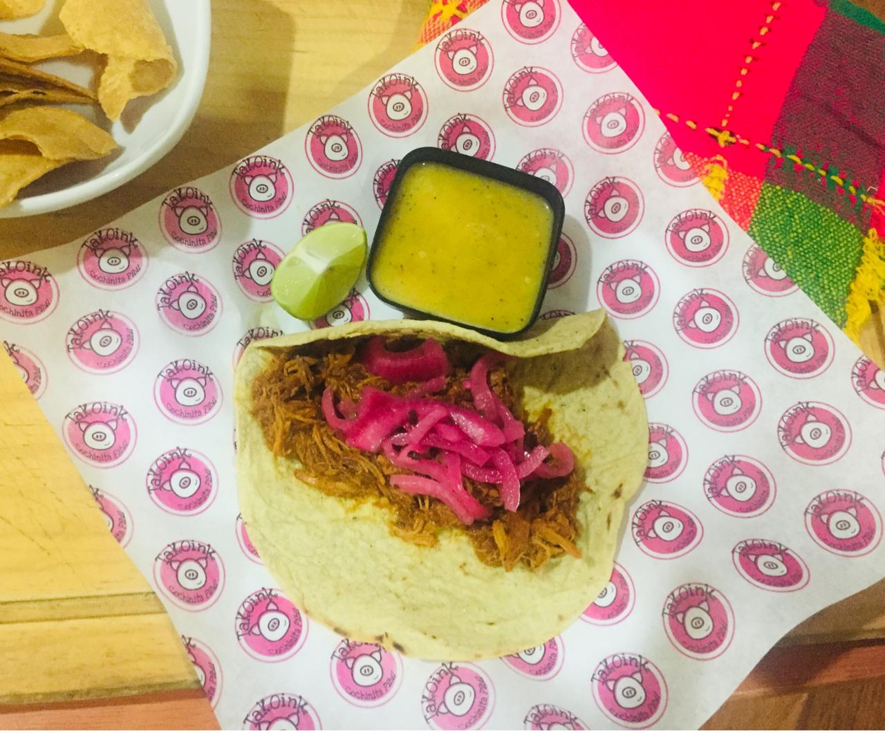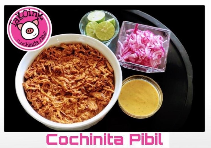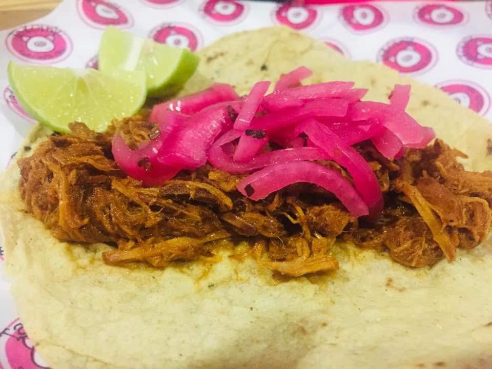 Cochinita Pibil , acompañada de tortillas de maíz, cebolla morada y salsa habanero