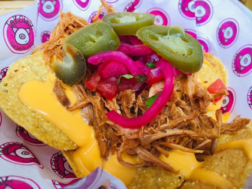 Totopos para nachos con queso derretido acompañados de cochinita pibil, pico de gallo y toque especial de jalapeños