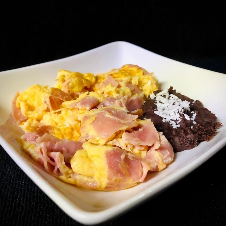 Huevo revuelto con ingrediente a elección, acompañado con frijoles y un bolillo.
