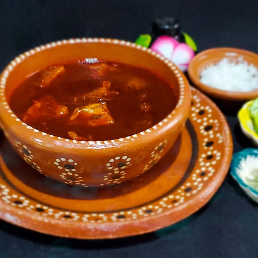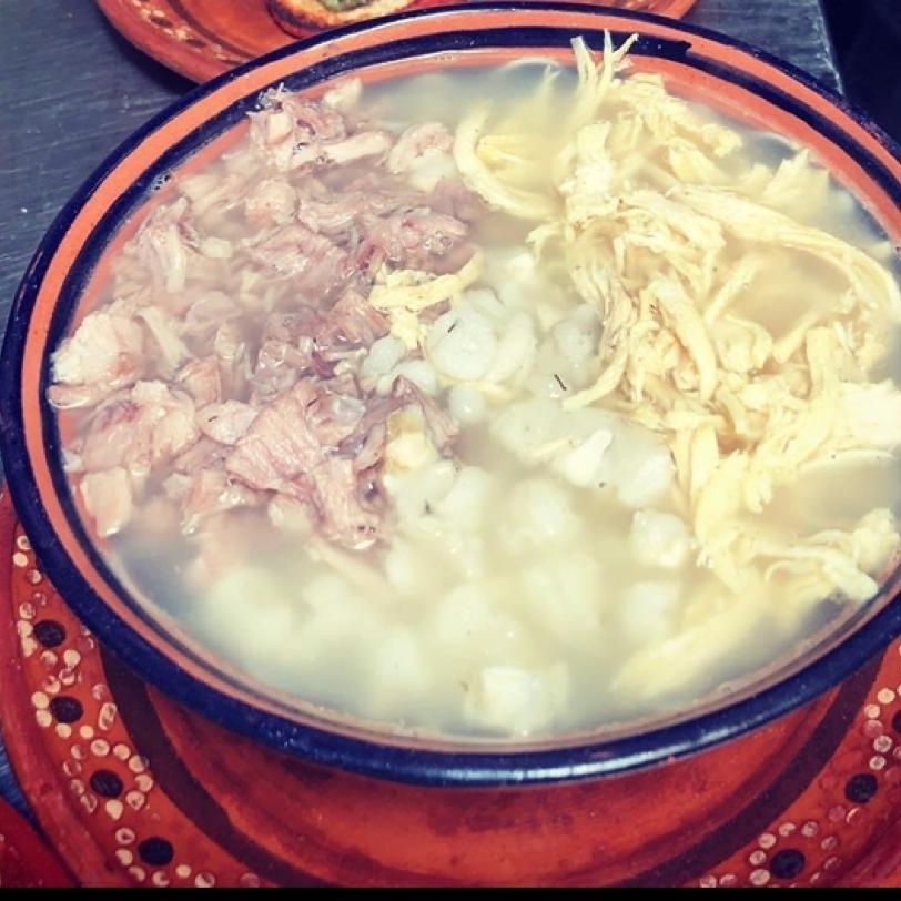 Pozole blanco y sus complementos, con proteína de tu elección (lechuga, cebolla, rábano, orégano, salsa de chile de árbol, crema, tostadas y chicharrón).