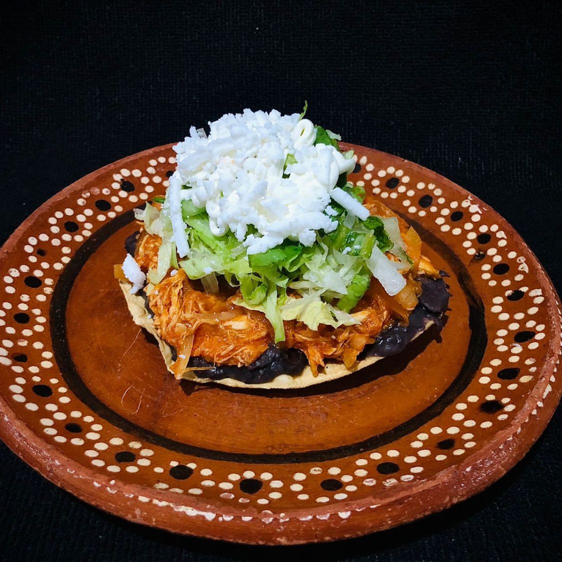 Tostada de cochinita con frijol refrito, lechuga, crema y queso.