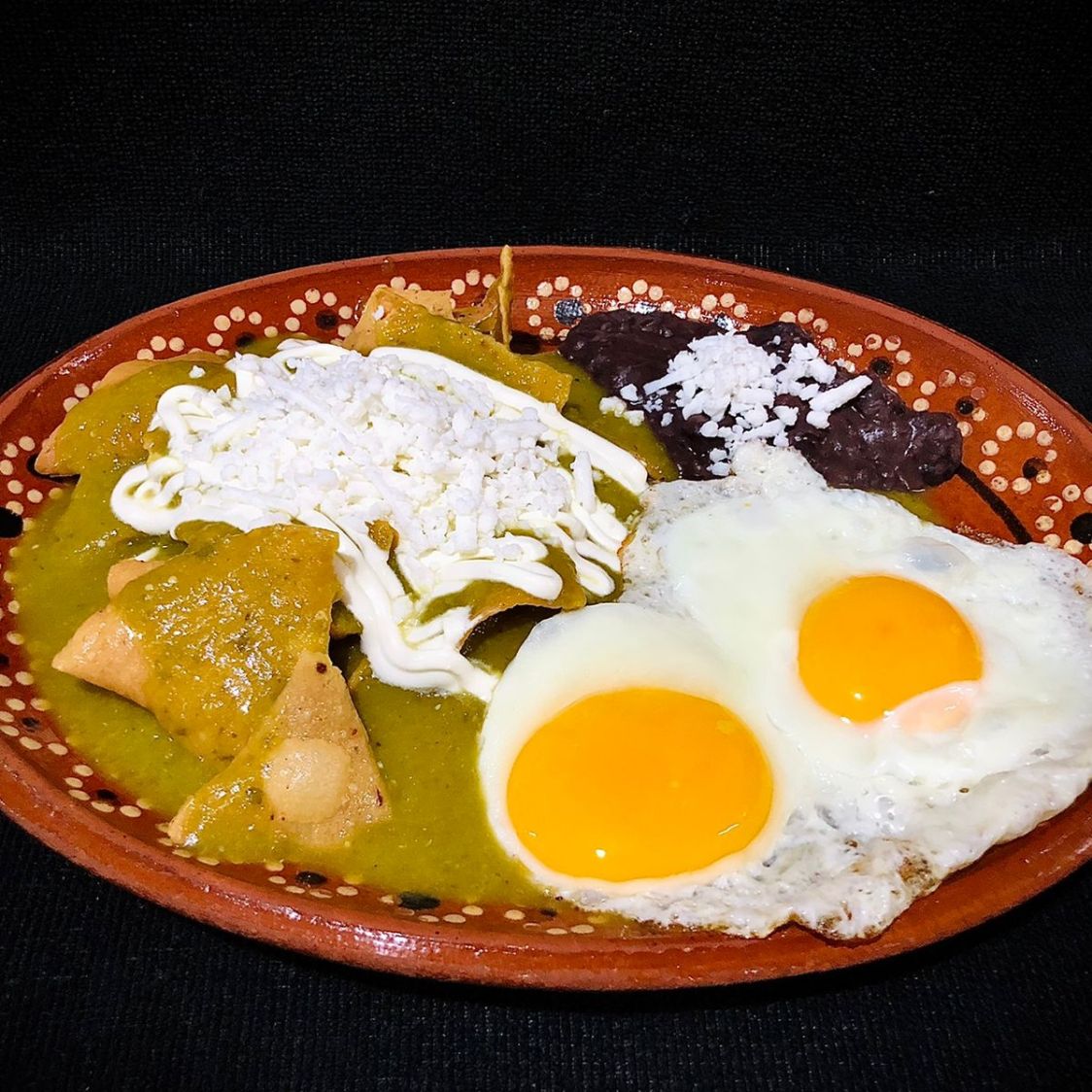 Huevo estrellado encima de tortilla con frijoles bañado en salsa verde y roja, queso, crema más un bolillo.