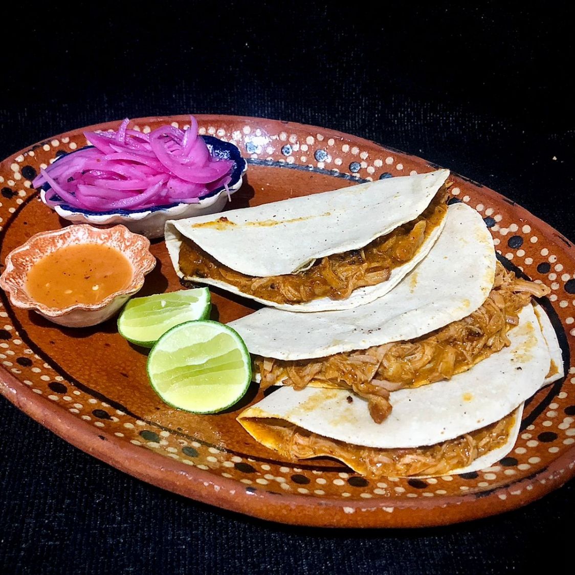 Tres piezas de tacos de cochinita con cebolla morada encurtida, limón y salsa habanero.