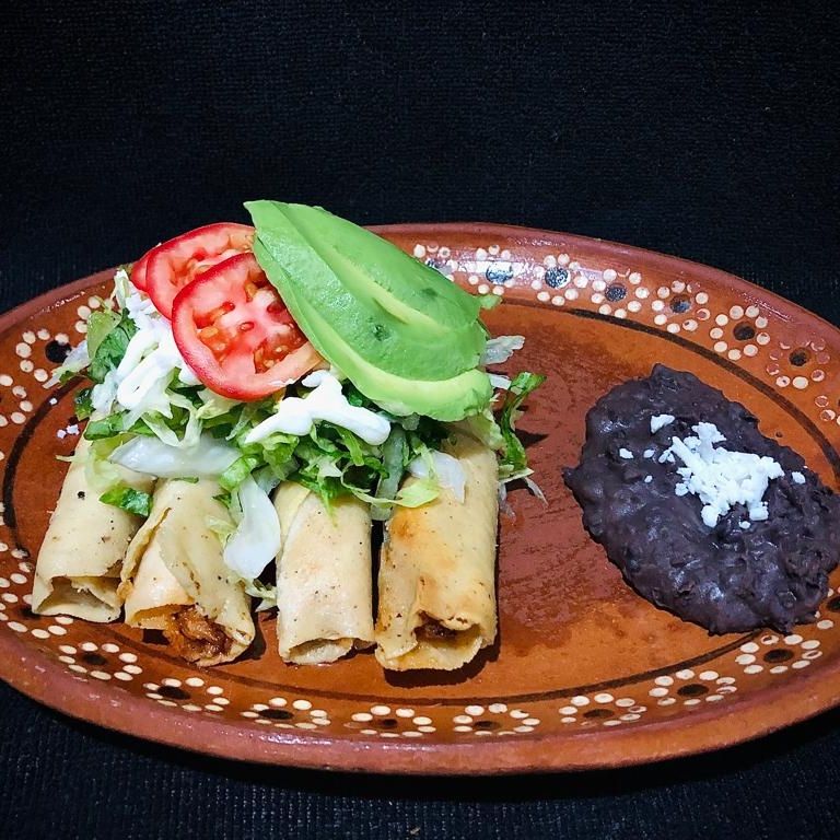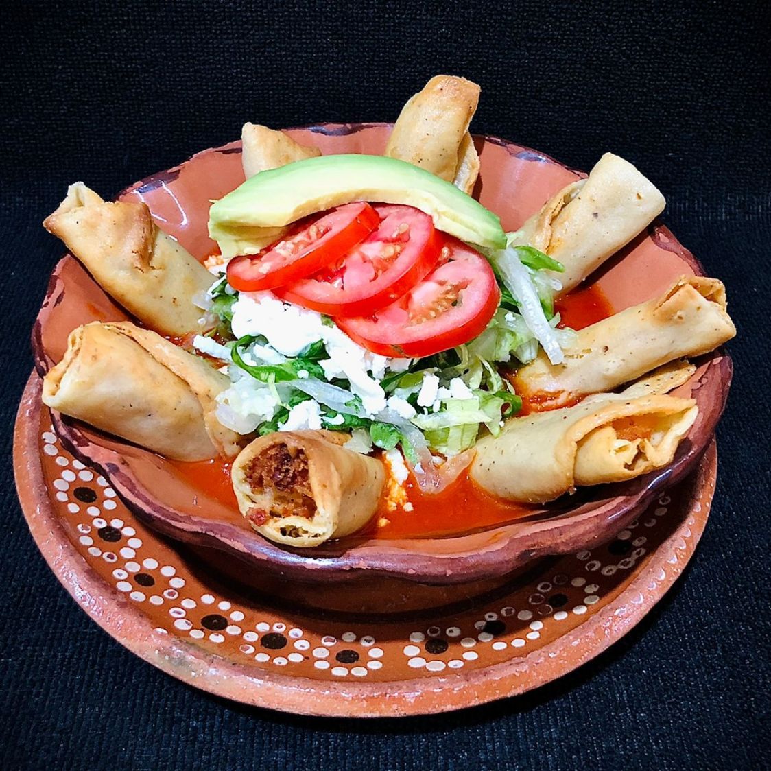 Tacos dorados con ingrediente al gusto, ahogados en salsa de tu elección con lechuga, queso, crema, jitomate y aguacate.