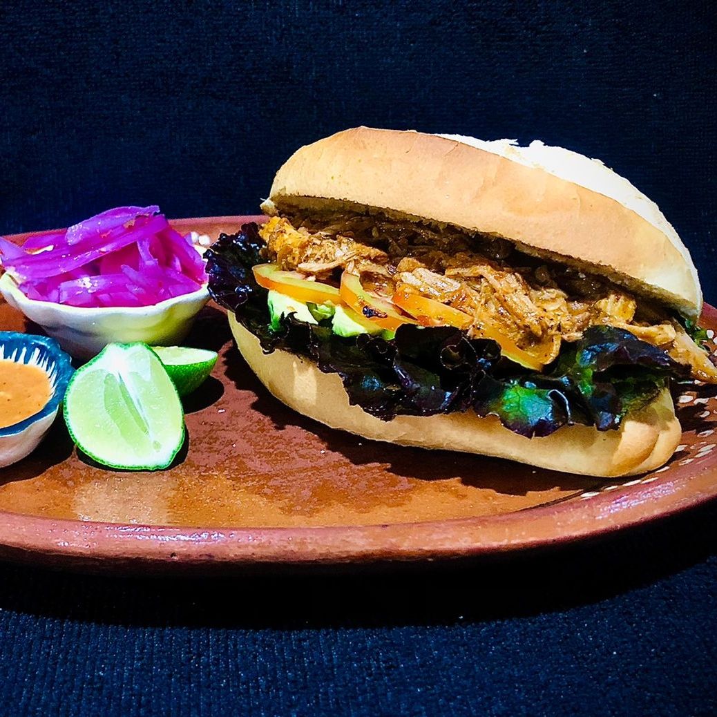 Torta de cochinita, con frijol refrito, lechuga, jitomate y aguacate, acompañado con cebolla morada encurtida y salsa habanero.