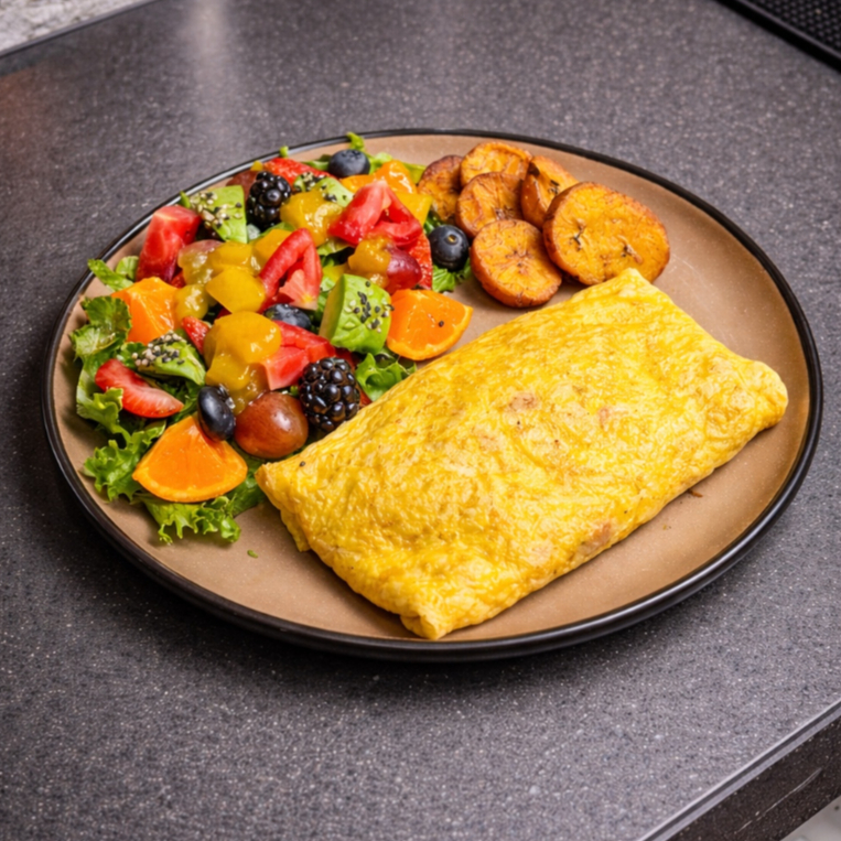 Omelette con queso y un ingrediente a elección, acompañado de ensalada y frijoles con un bolillo.