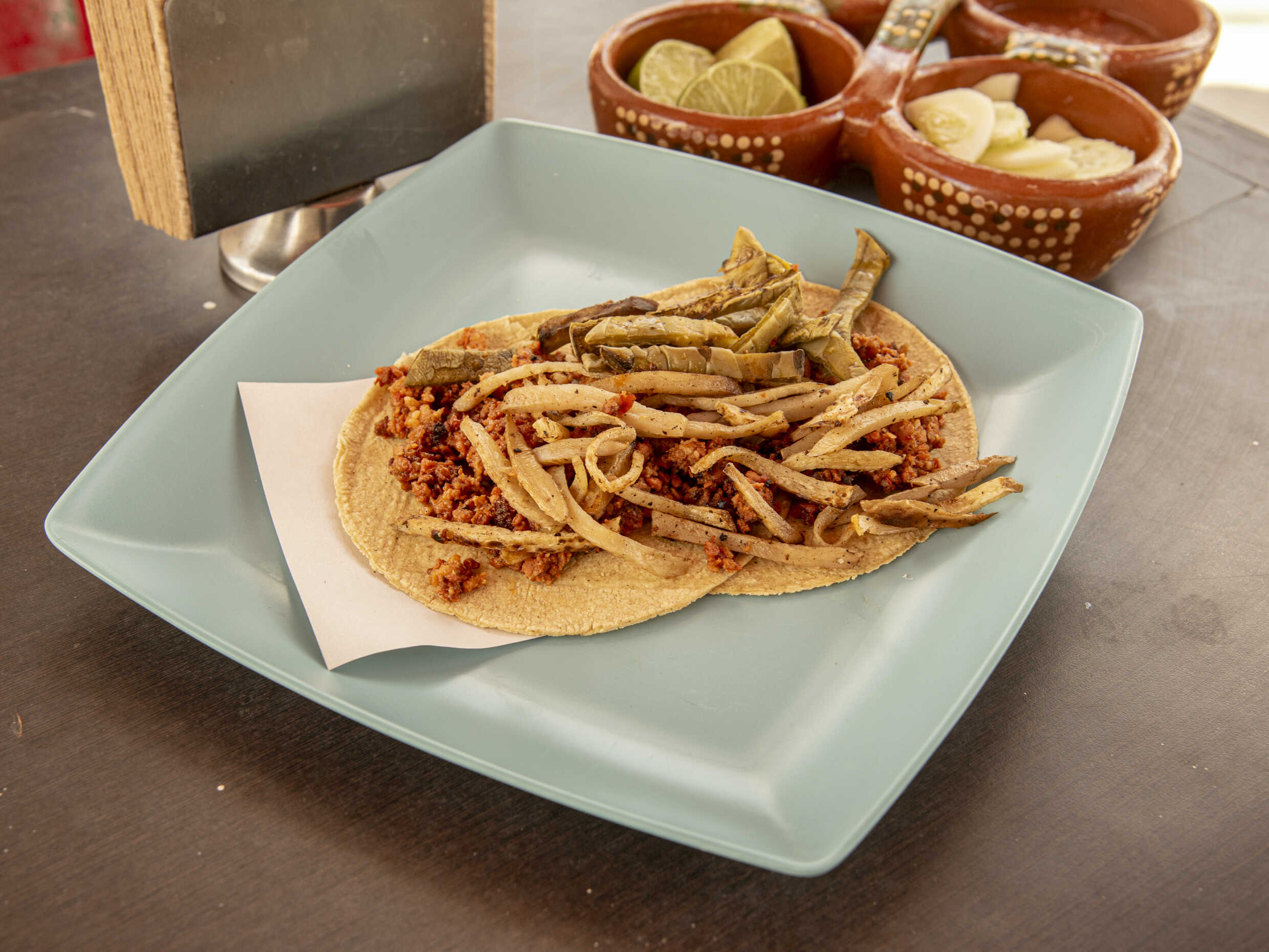 taco sirlion llevado al carbon en sus jugos con queso fundido MAS CHORIZO y con papa fritas encimas cebollitas caramelizadas y sazonadas