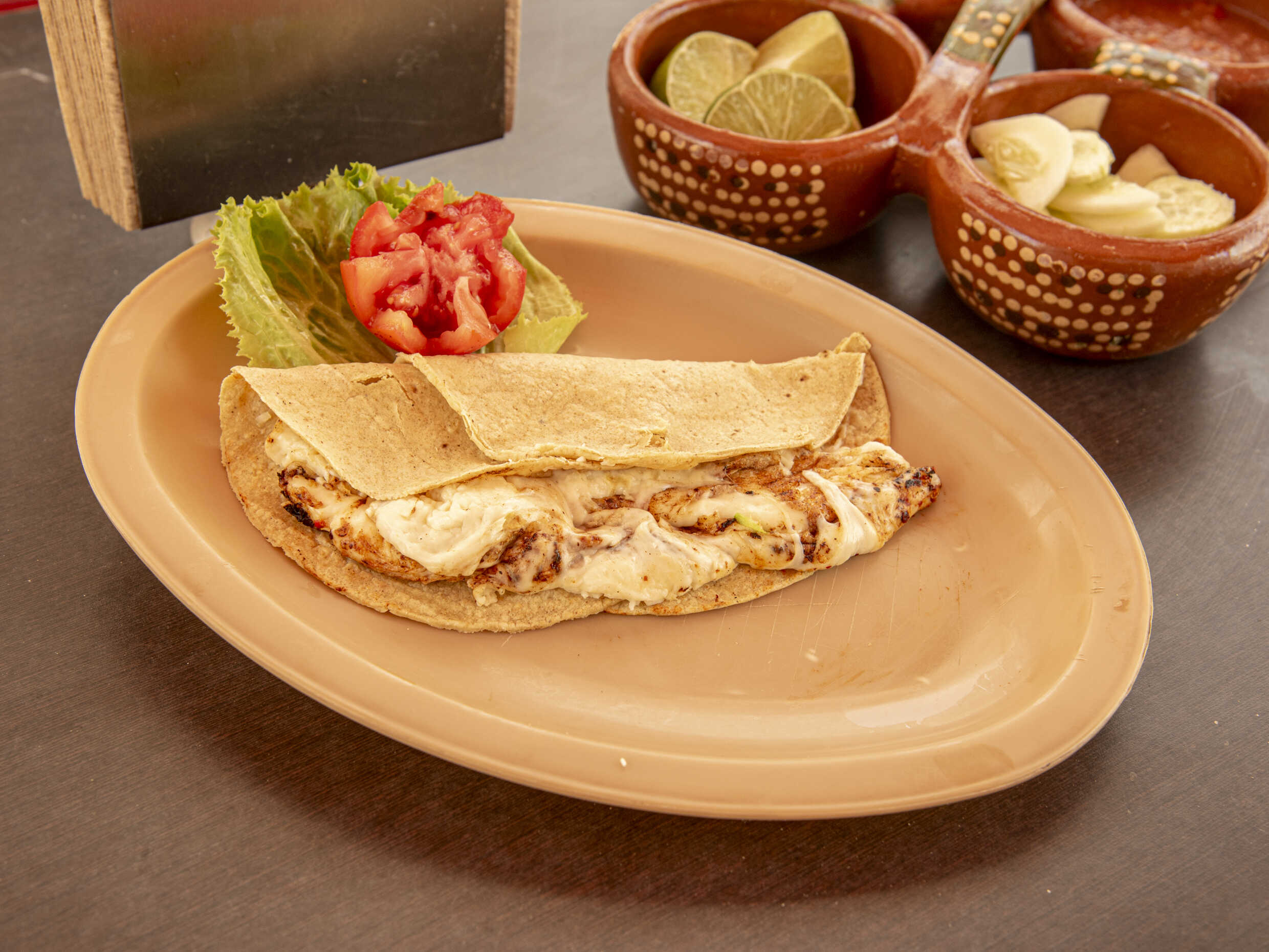 Quesadilla de doble tortilla con queso fundido bañada en jugo de carne y con papa fritas encimas cebollitas caramelizadas y sazonadas