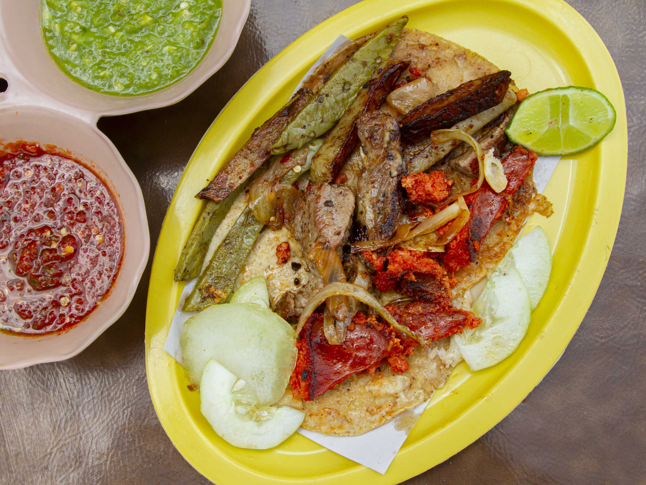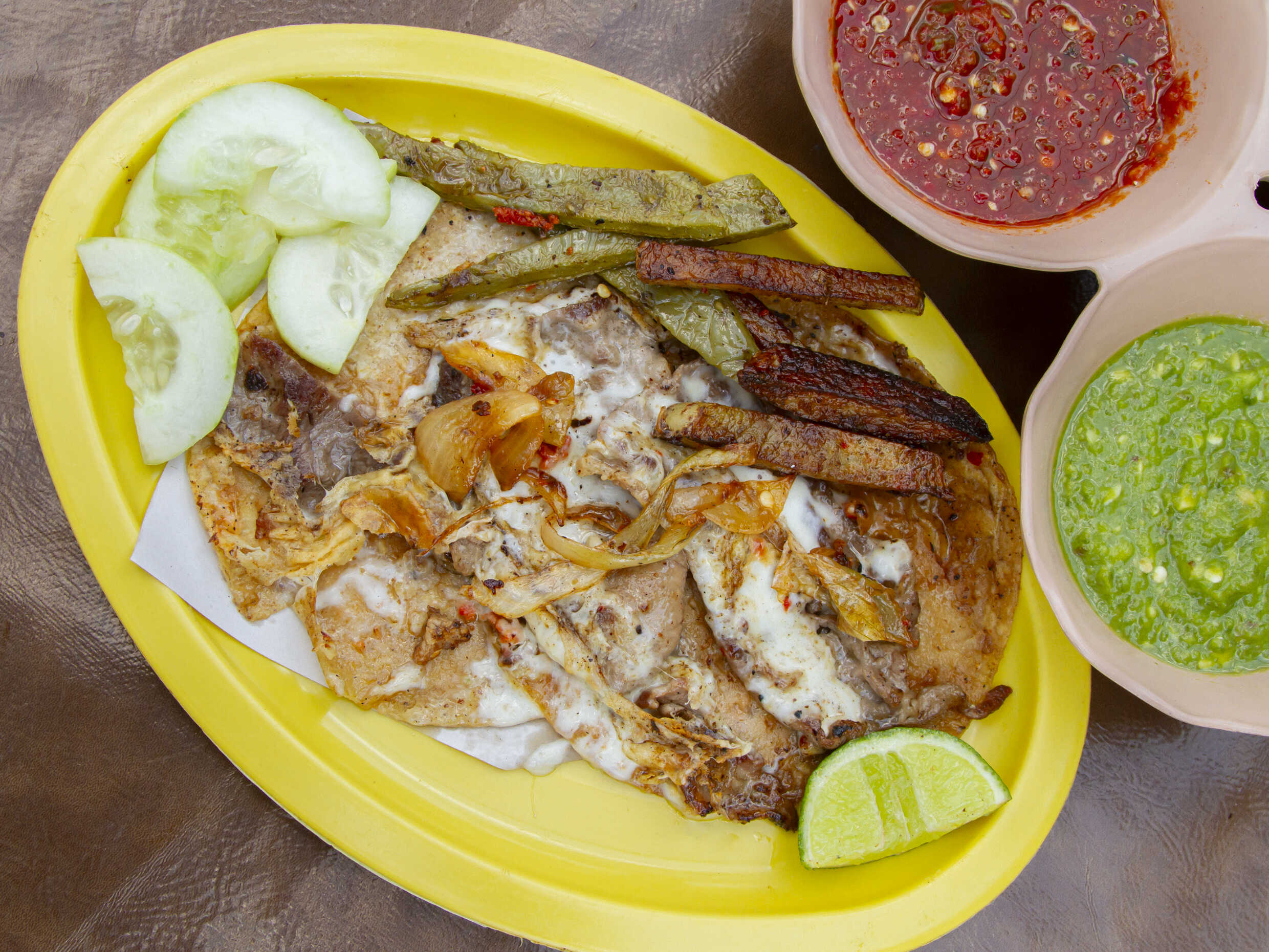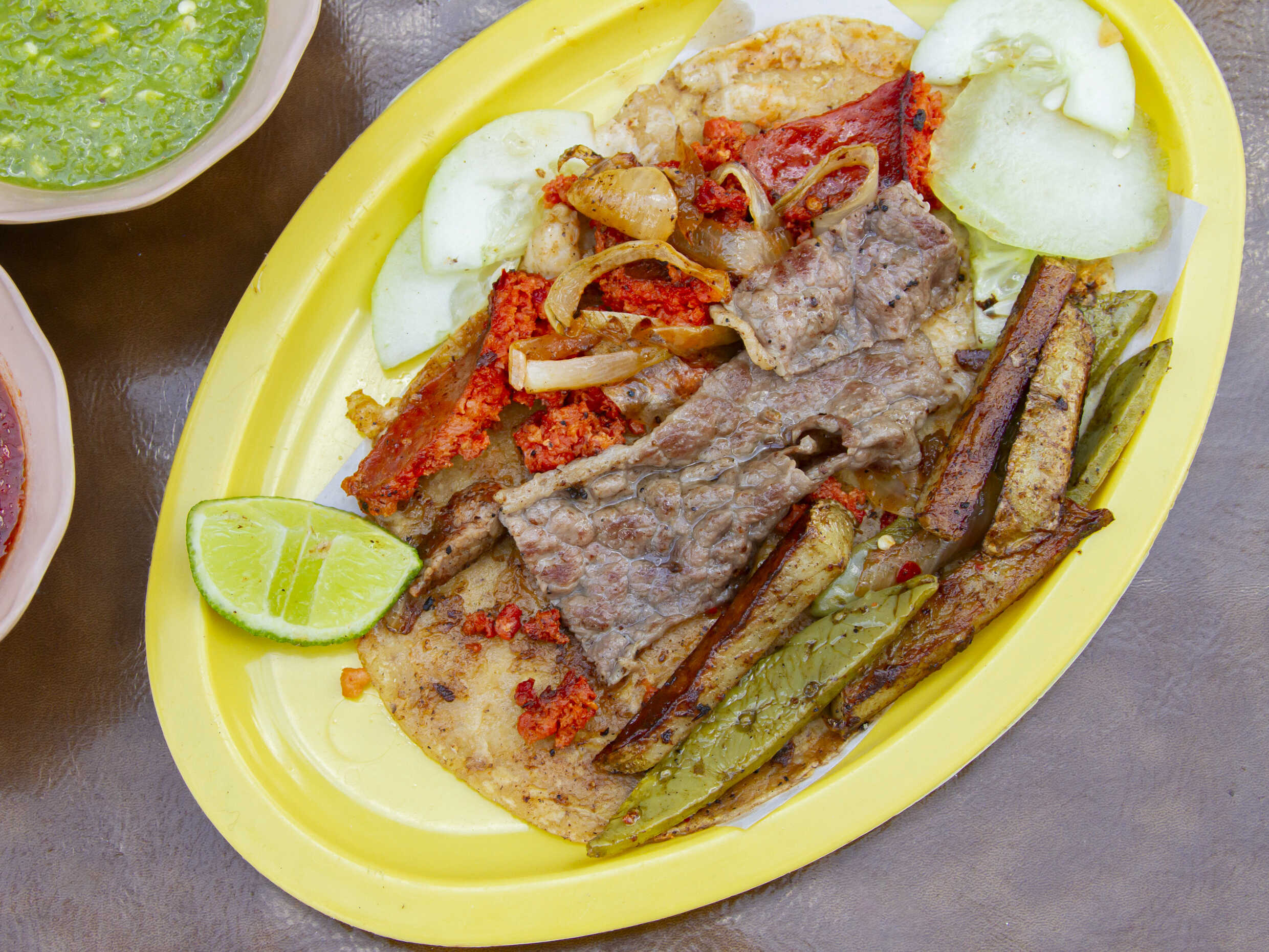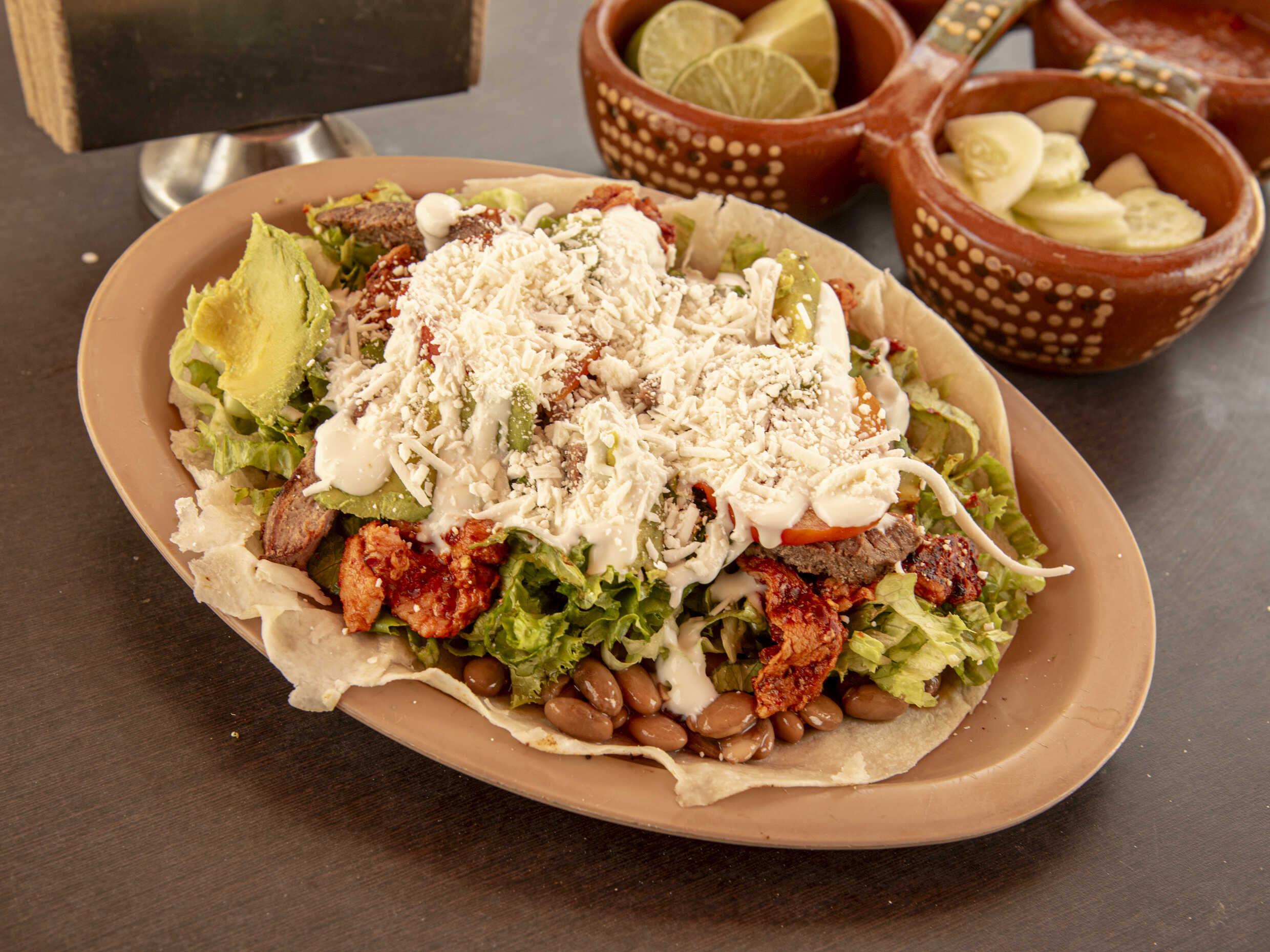 tlayuda a la plancha con ARRACHERA CON PASTOR QUESO FUNDIDO ACOMPAÑADA DE lechuga una base de frijoles, aguacate lechuga mas crema y queso rallado encima