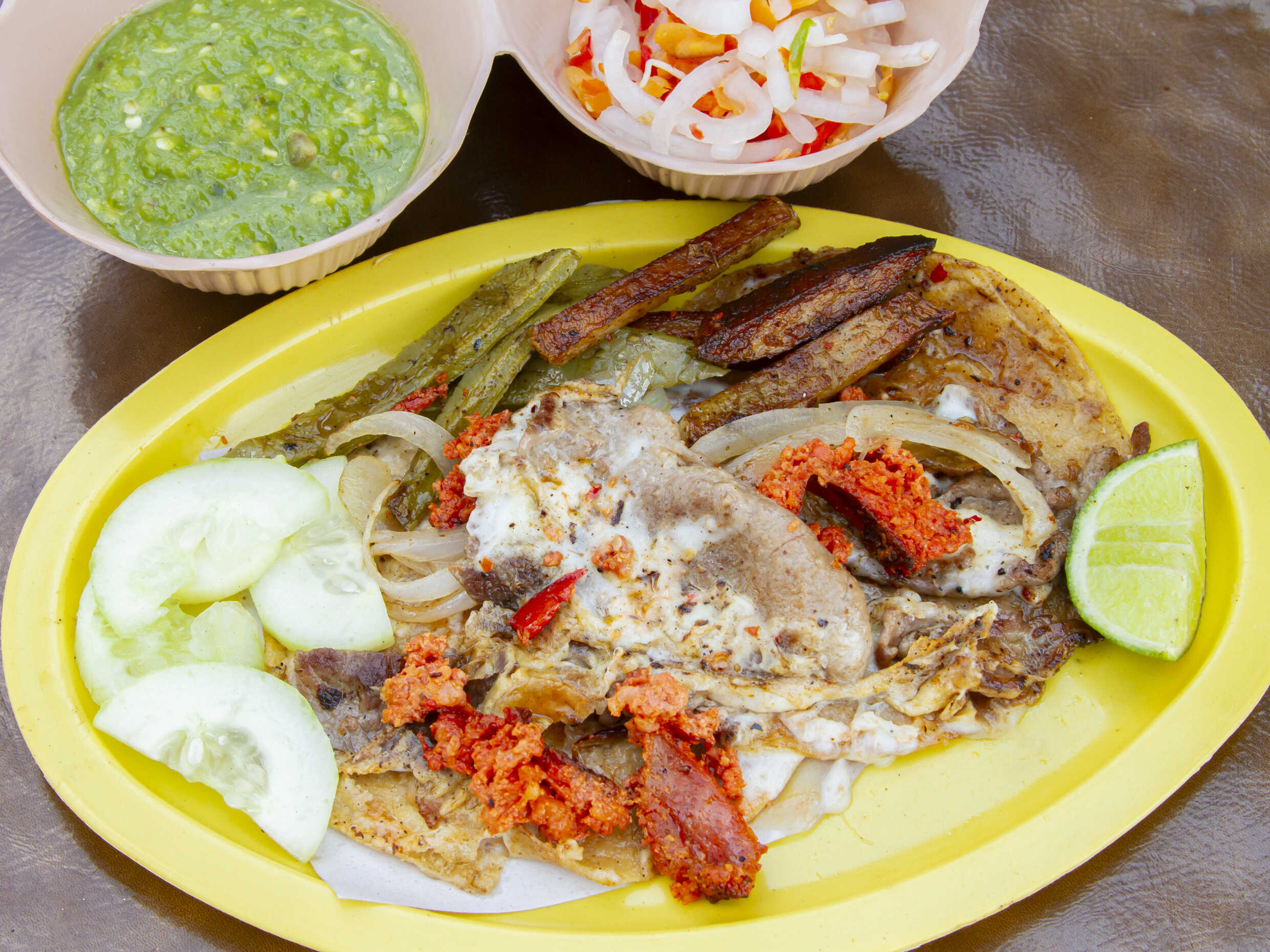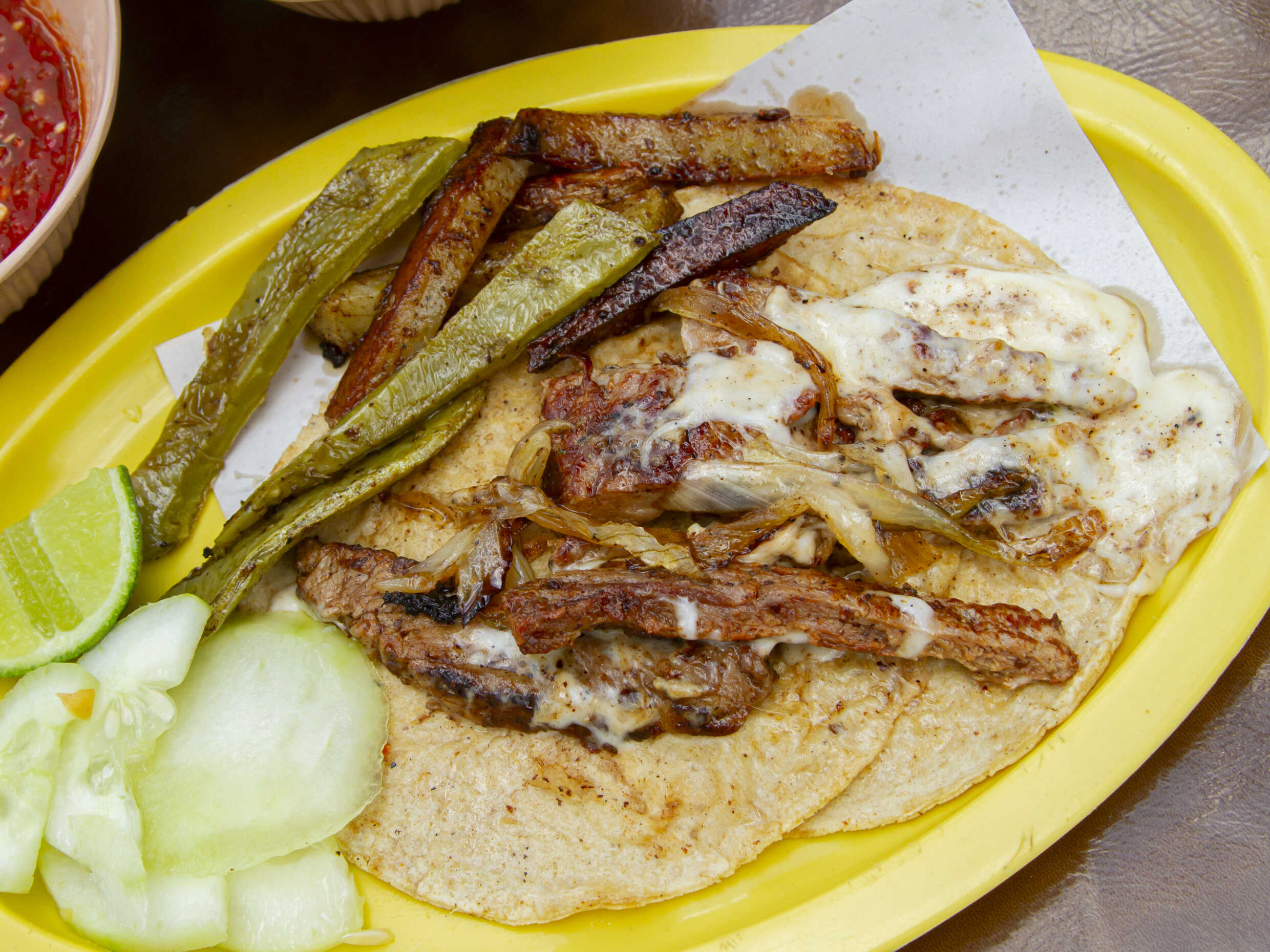 costra queso fundido con arrachera jugosa ala carbon con pimiento cebollitas sazonas nopalitos y papas fritas