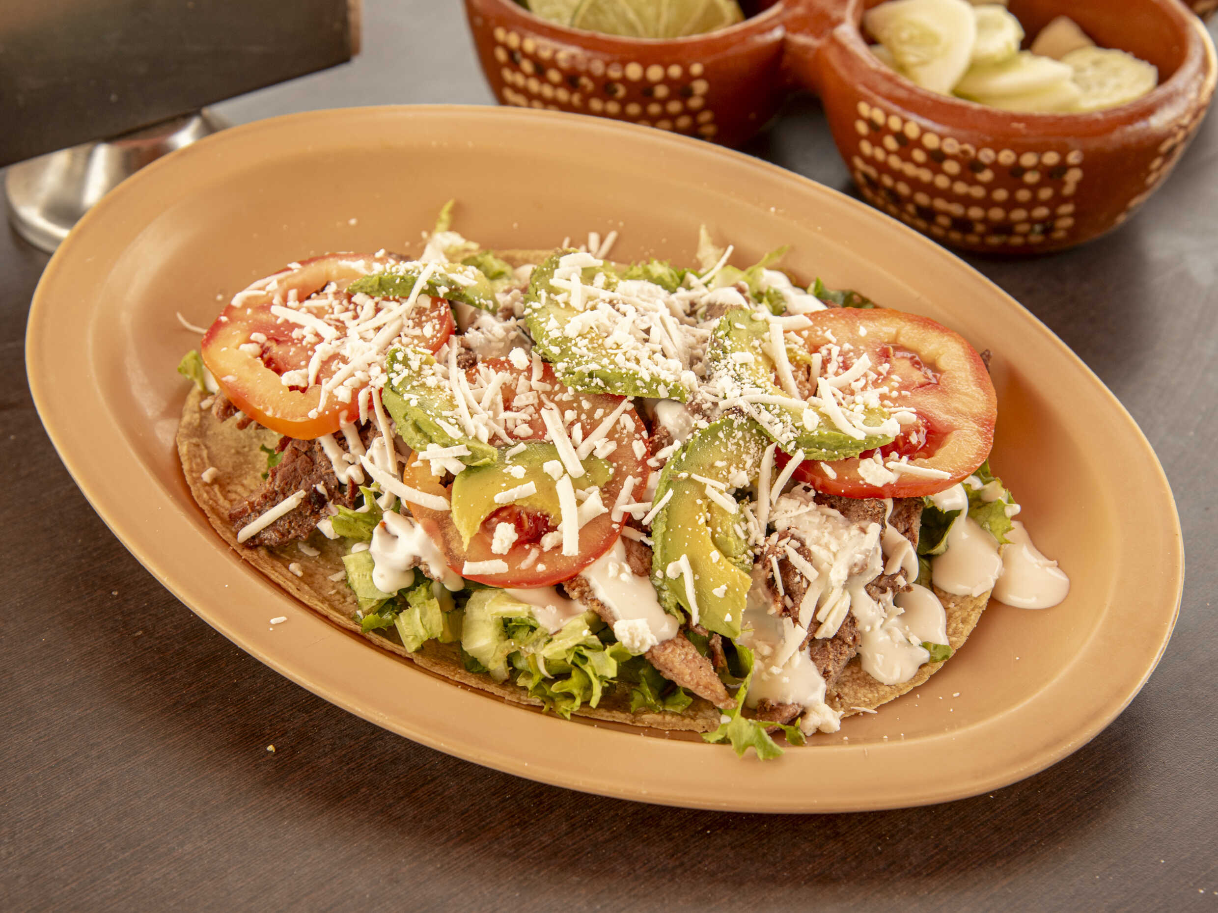 huarache de arrachera especial con queso fundido , tortilla grande bañada en en frijoles mas cebolla, lechuga, aguacate, jitomate mas crema y queso rallado
