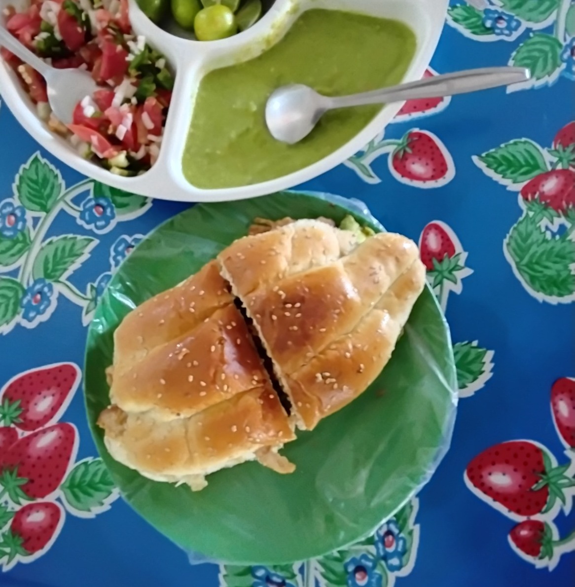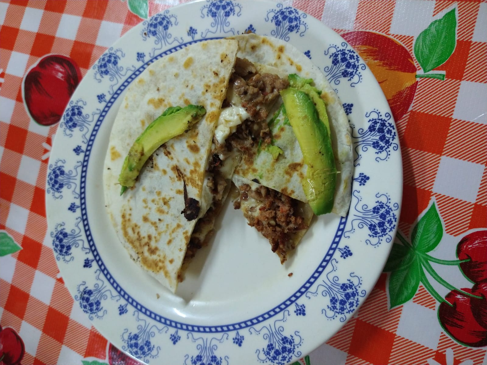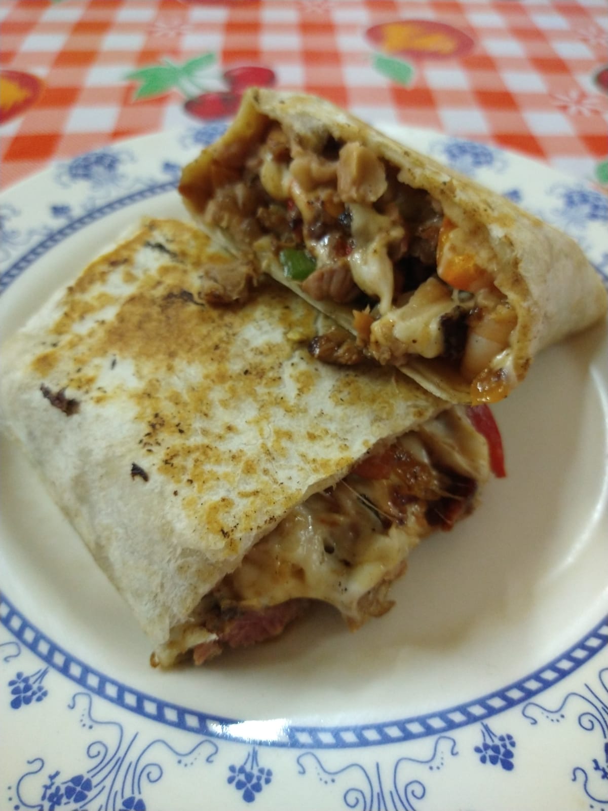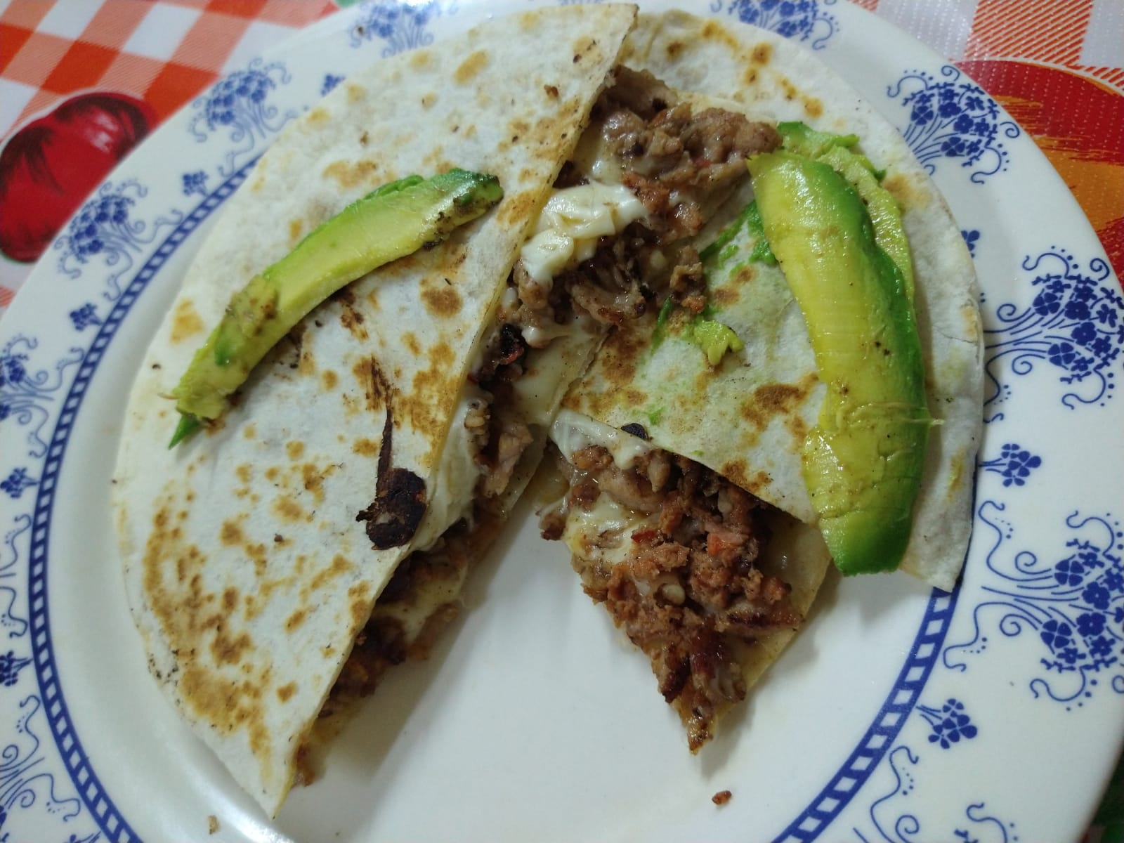 Adobada, queso, tortilla de harina, cebolla, morón, frijoles.