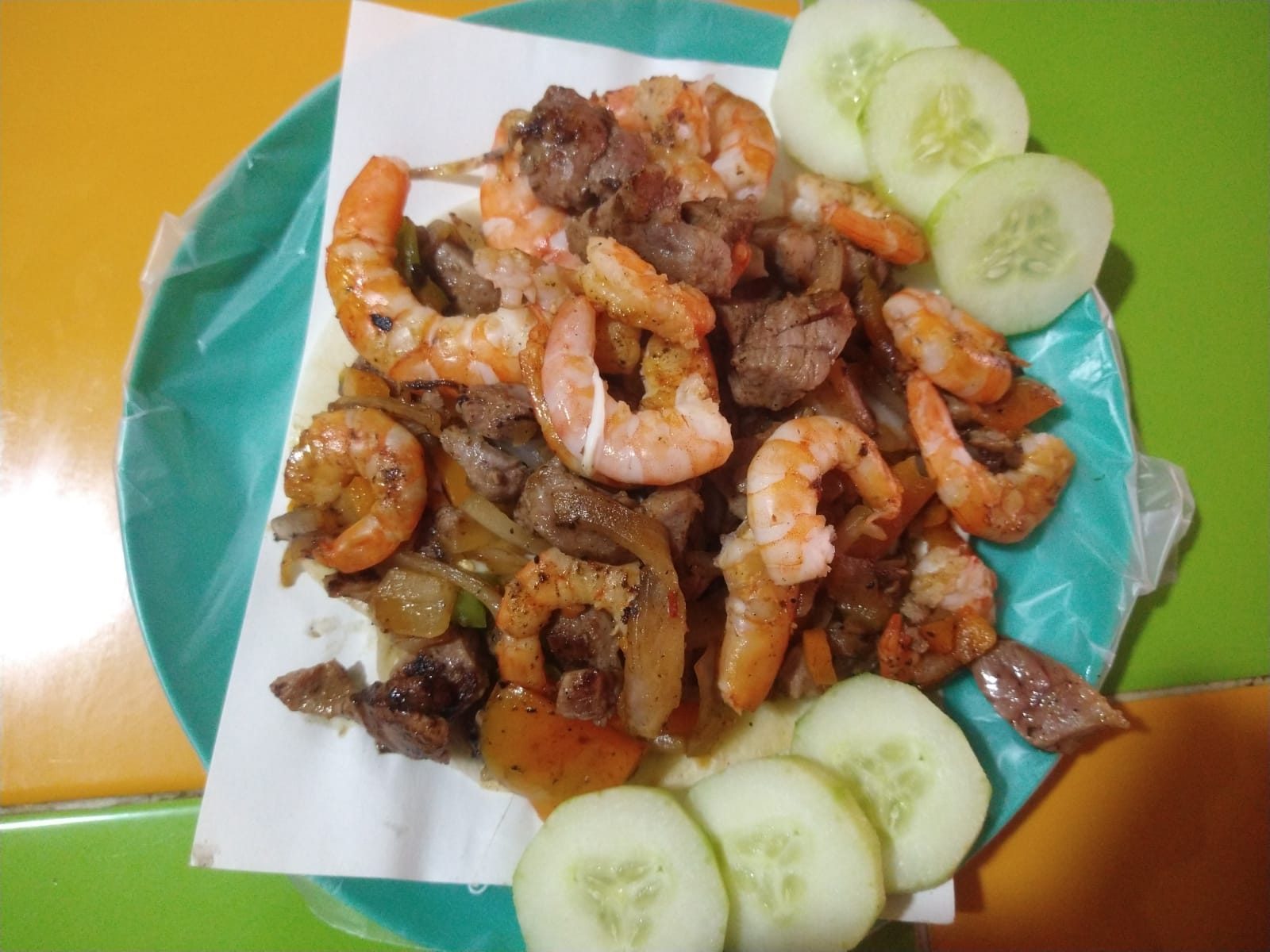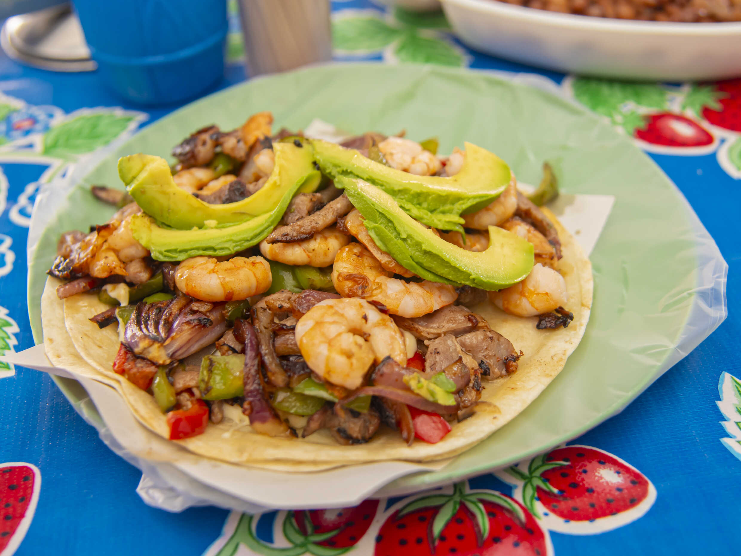 Tortilla de harina, arrachera, queso, camarón.