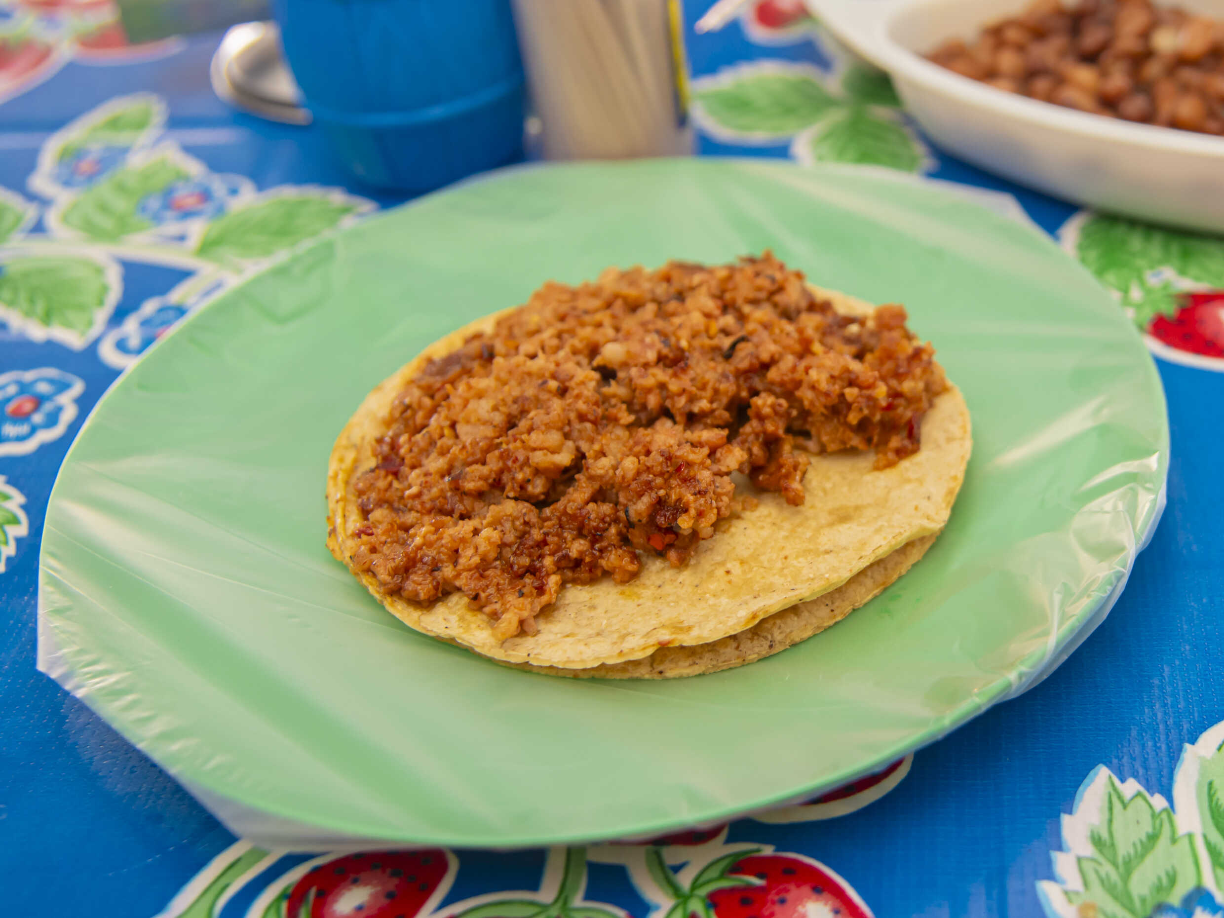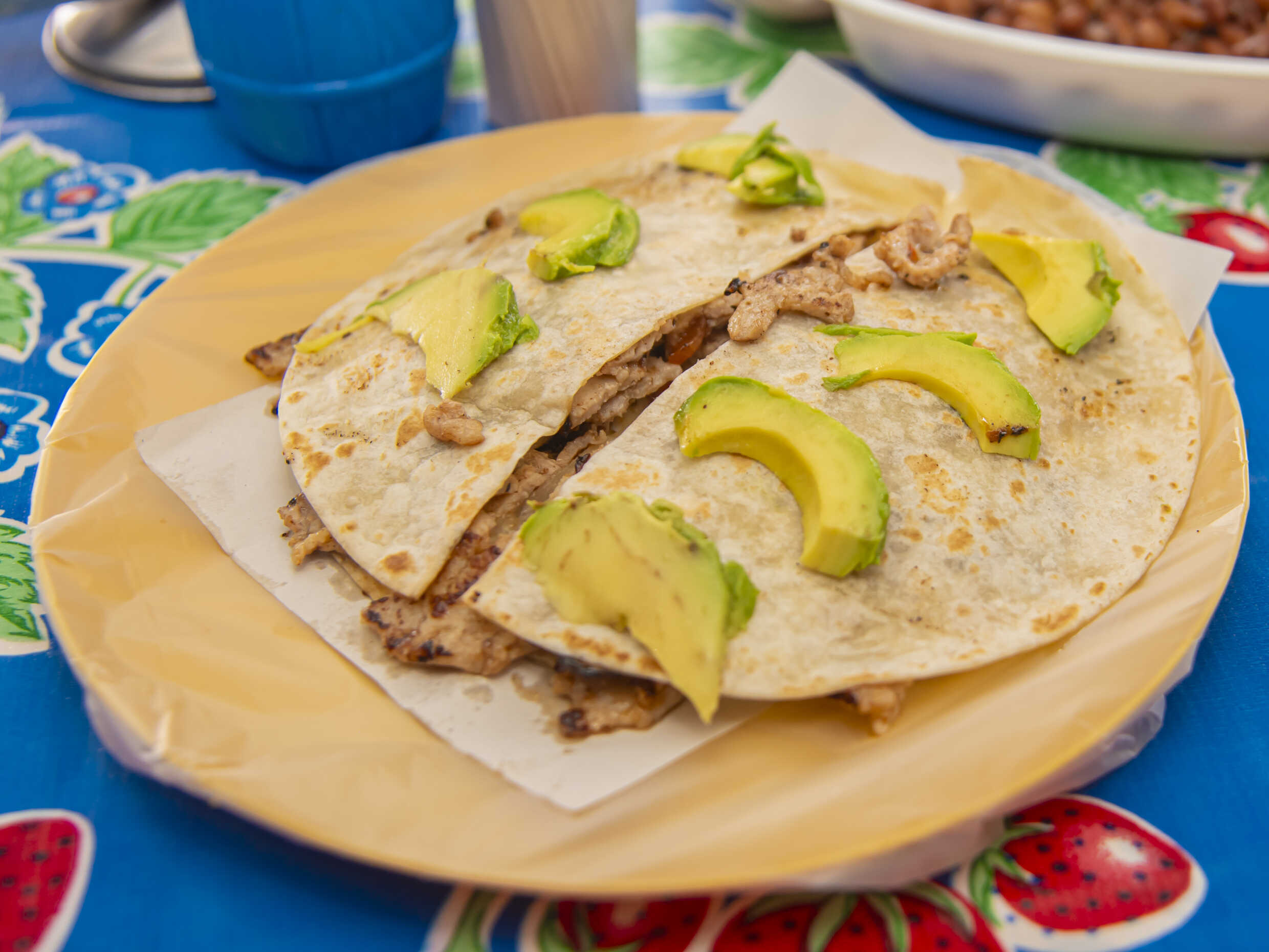 Pollo, morrón, cebolla y queso, tortilla de harina y frijoles.