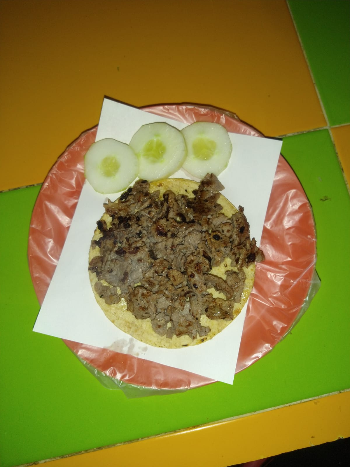 1 taco de tortilla de maíz taquera, con cebolla morrón, 150 gramos de chuleta, 150 gramos de longaniza, jamón, salsa verde y salsa roja. Porción personal: 80 gramos.
