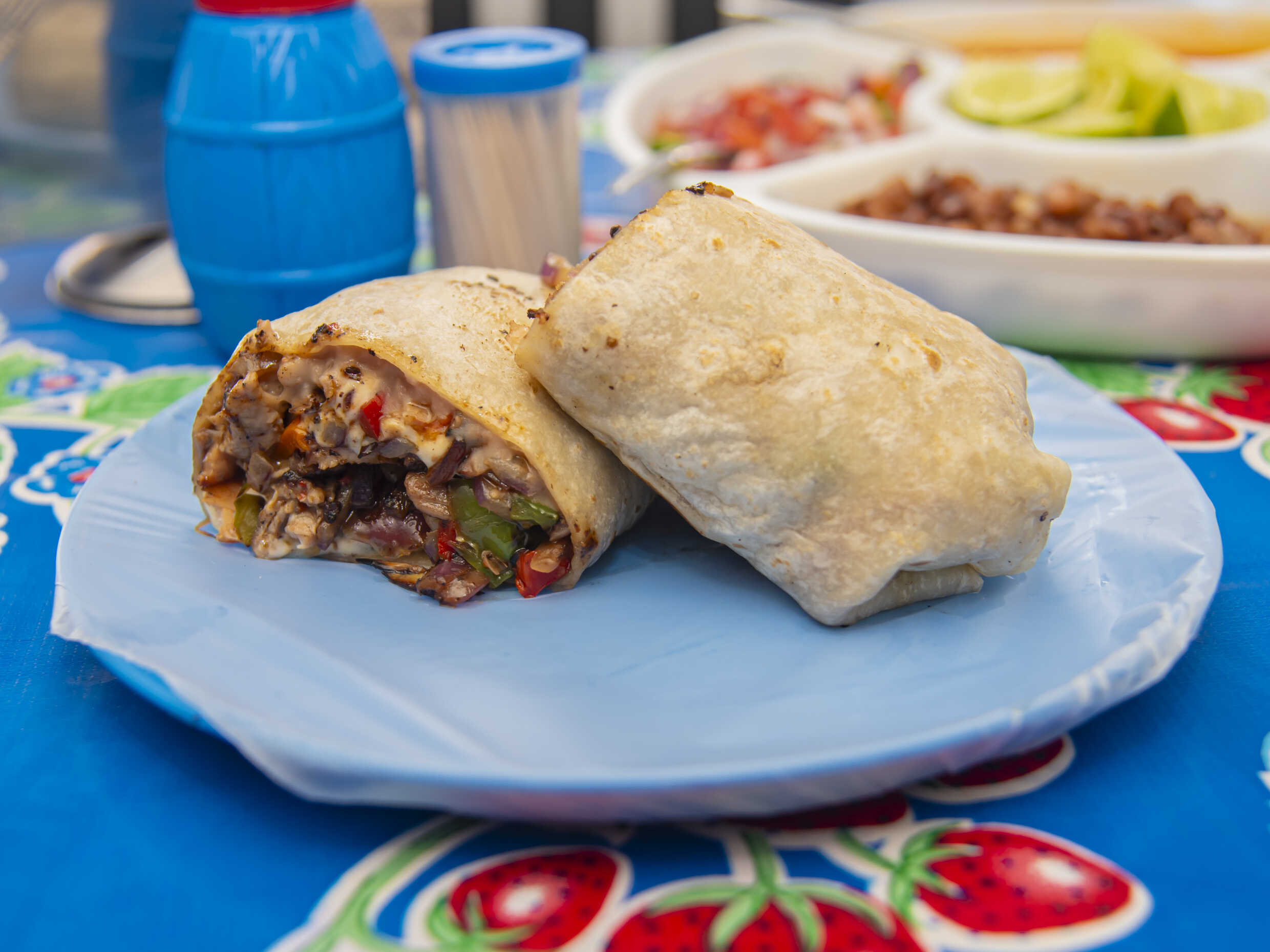 Bistec, morrón, cebolla, tortilla de harina y frijoles.