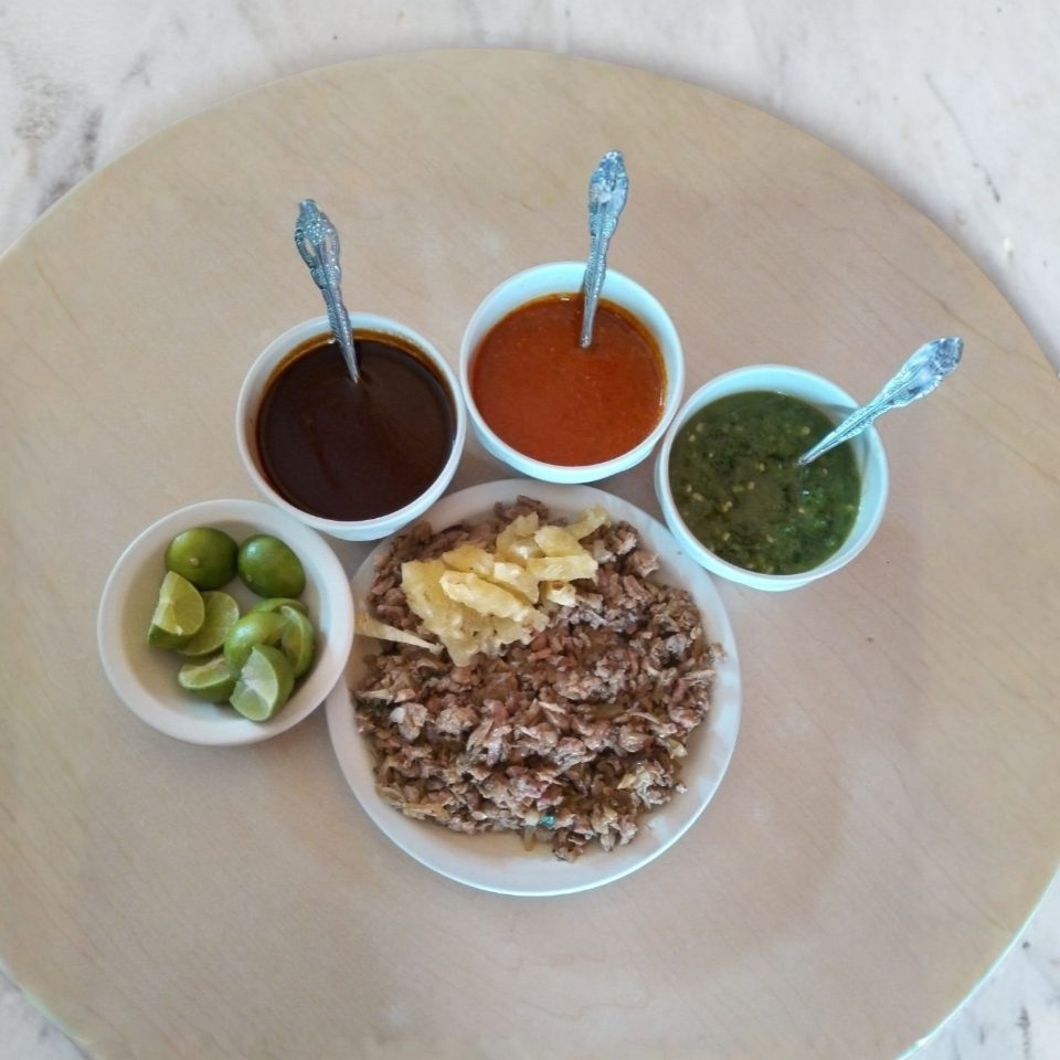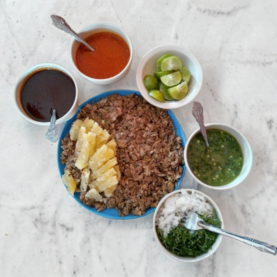 Adobada acompañada de nopal, cebolla y tortillas de maíz.