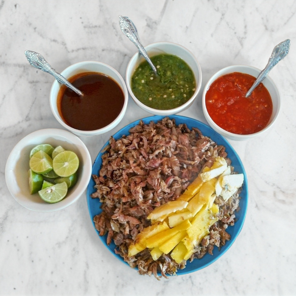 Gringa de adobada, con queso y carne, acompañado de salsas y limones.