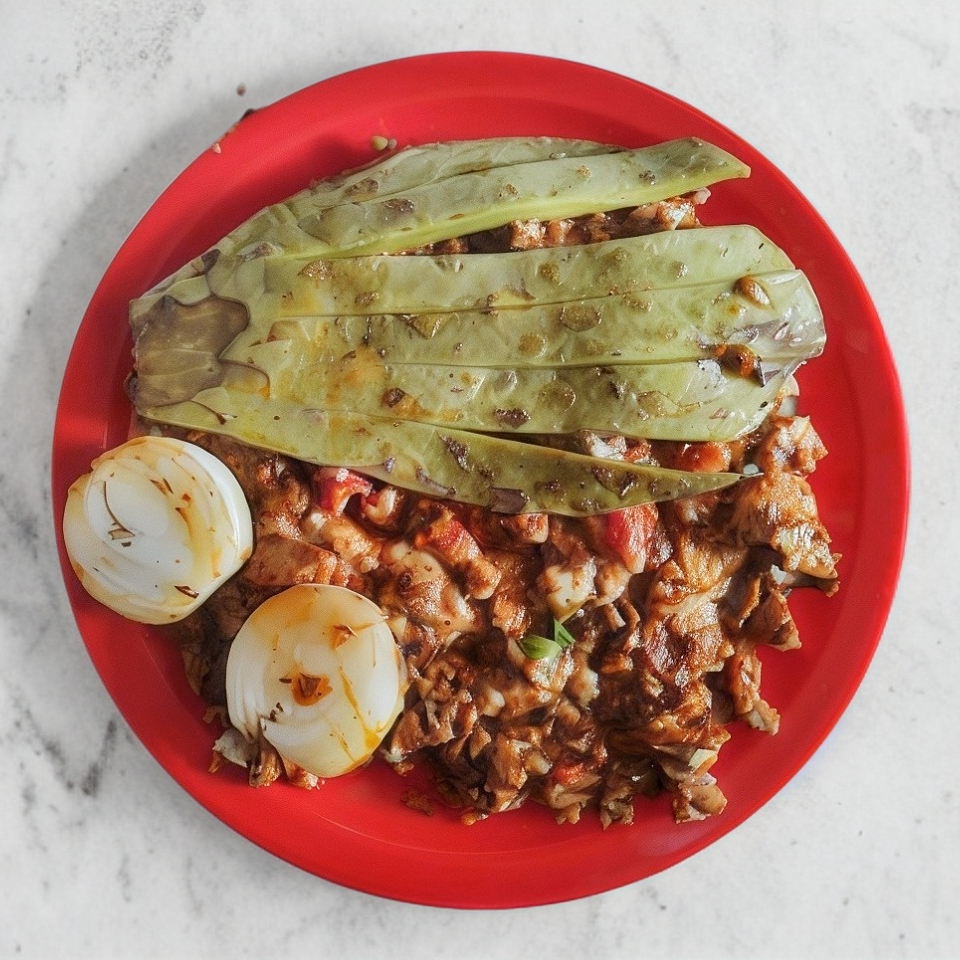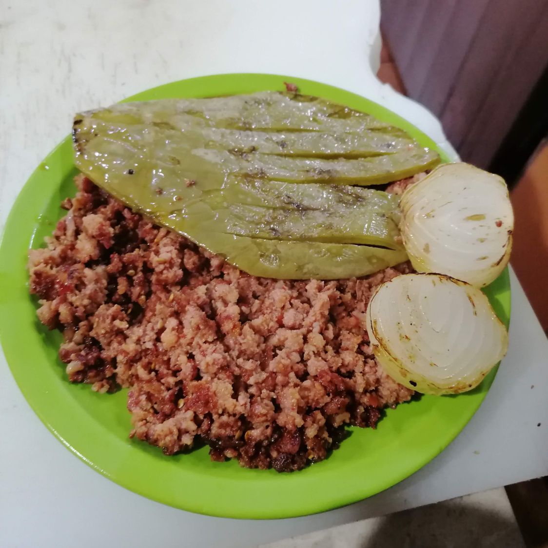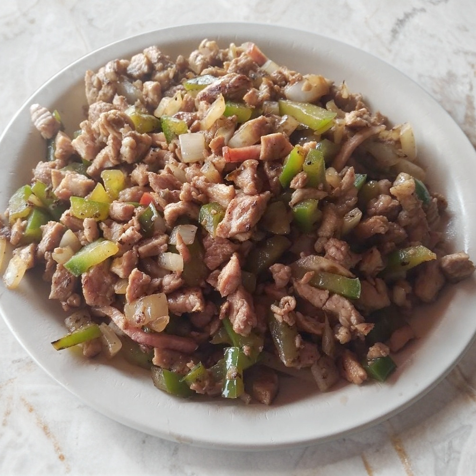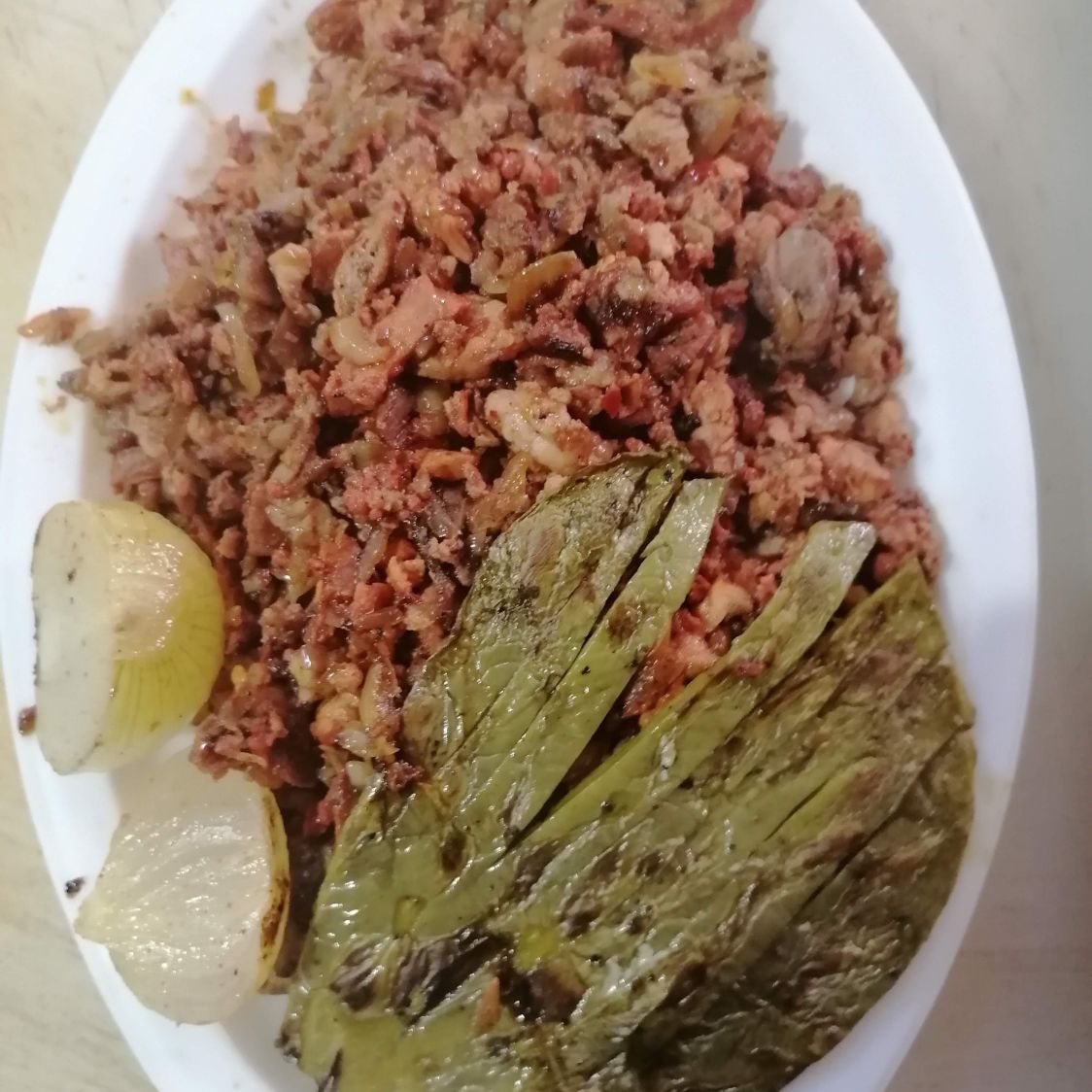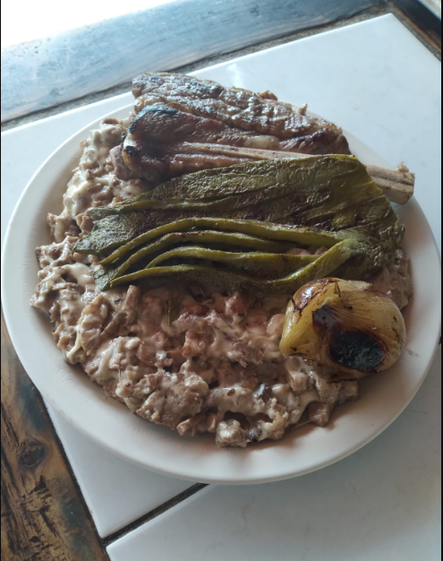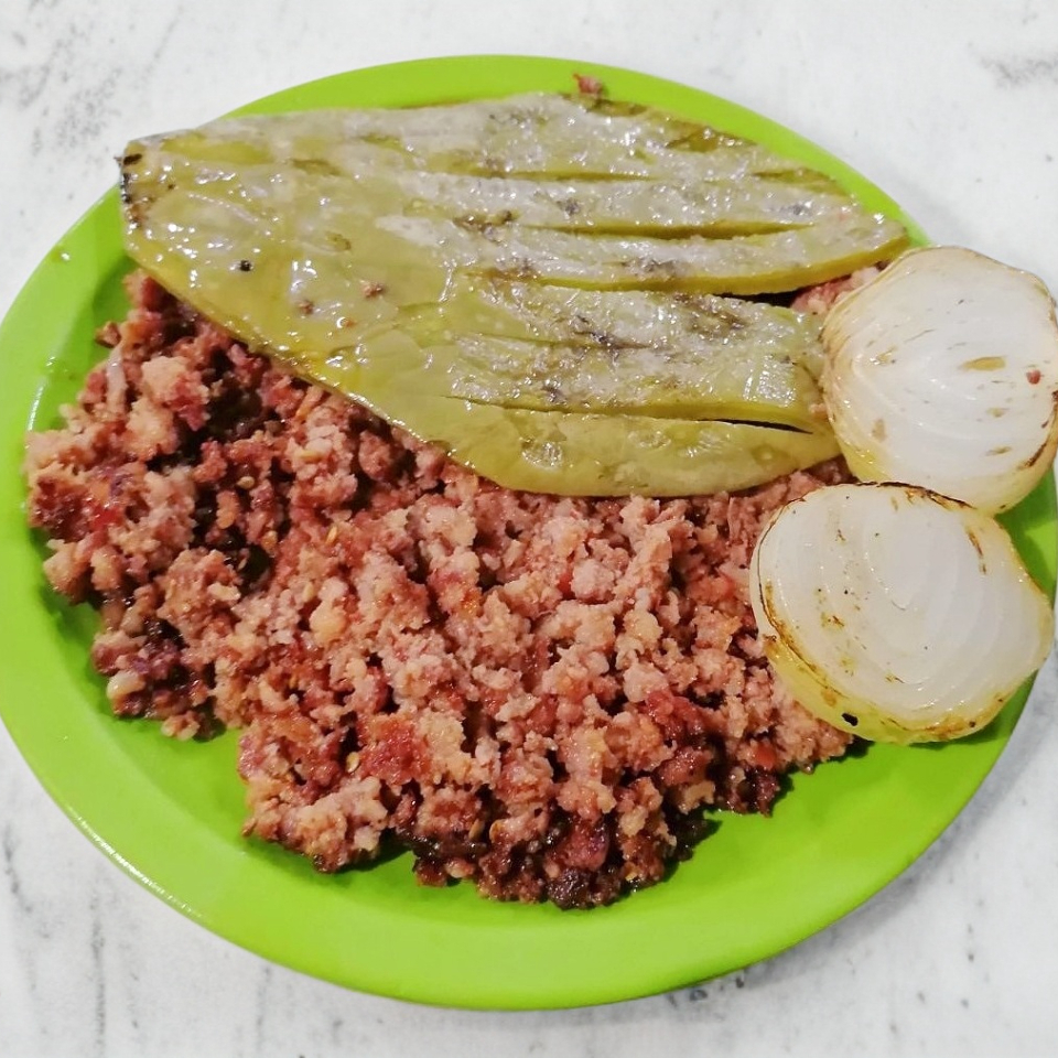 Carne de cerdo con pimiento morrón cebolla y tocino acompañado de un nopal, cebolla asada y tortilla de maíz.