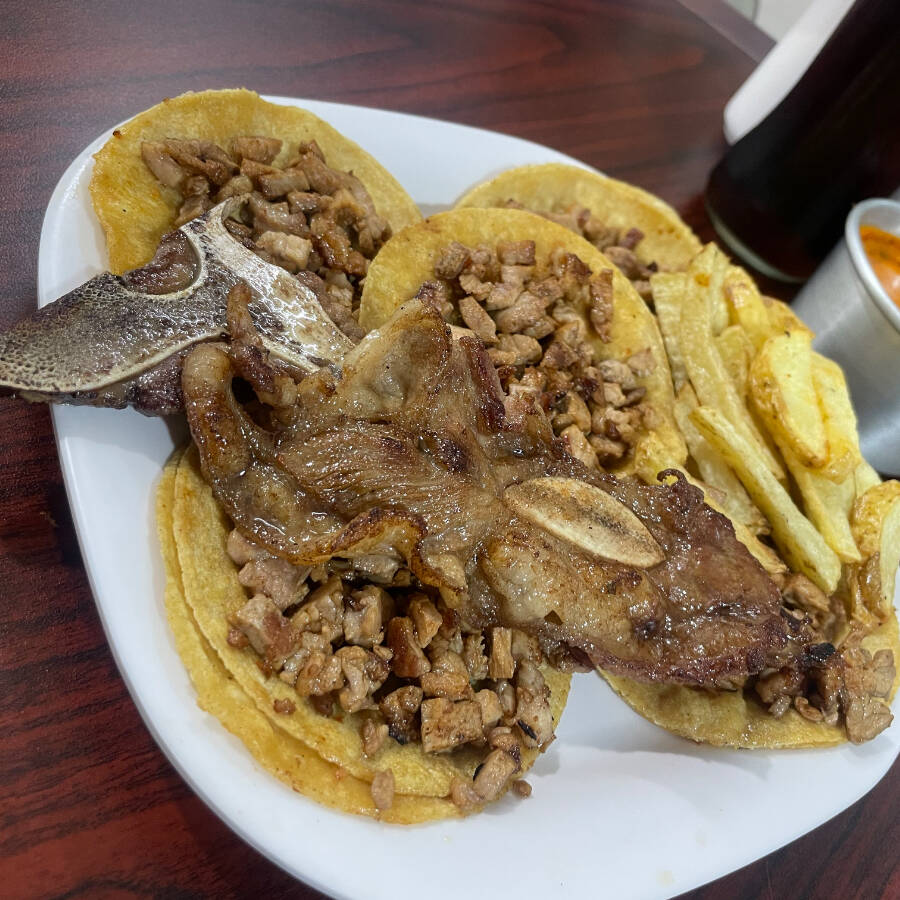 Costilla de Res asada, con su huesito, acompañado de papas fritas y cebollas