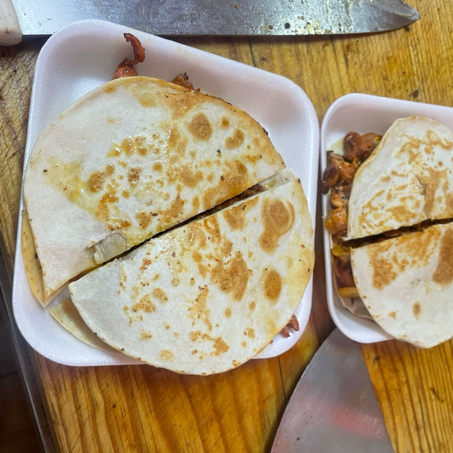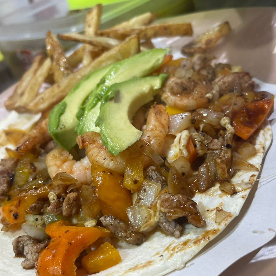 arrachera, morrón, cebolla, camarón, queso