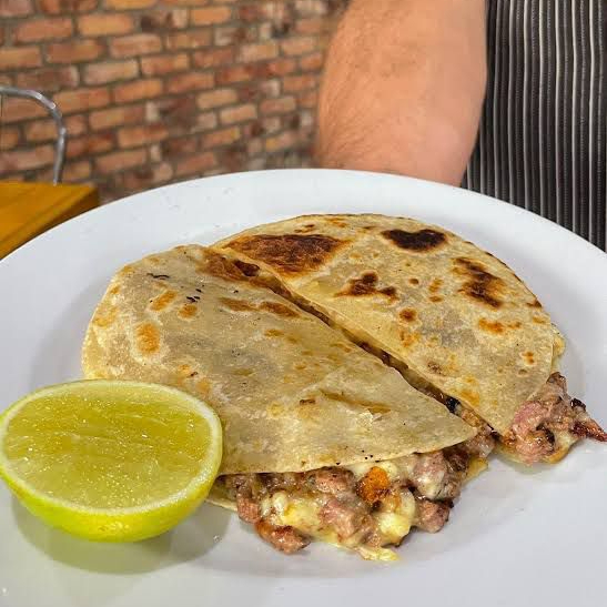 Tortilla de harina, carne, queso y papas