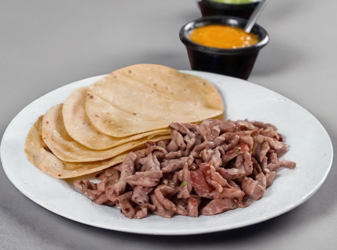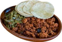 Porción de carne con nopalitos y tortillas.