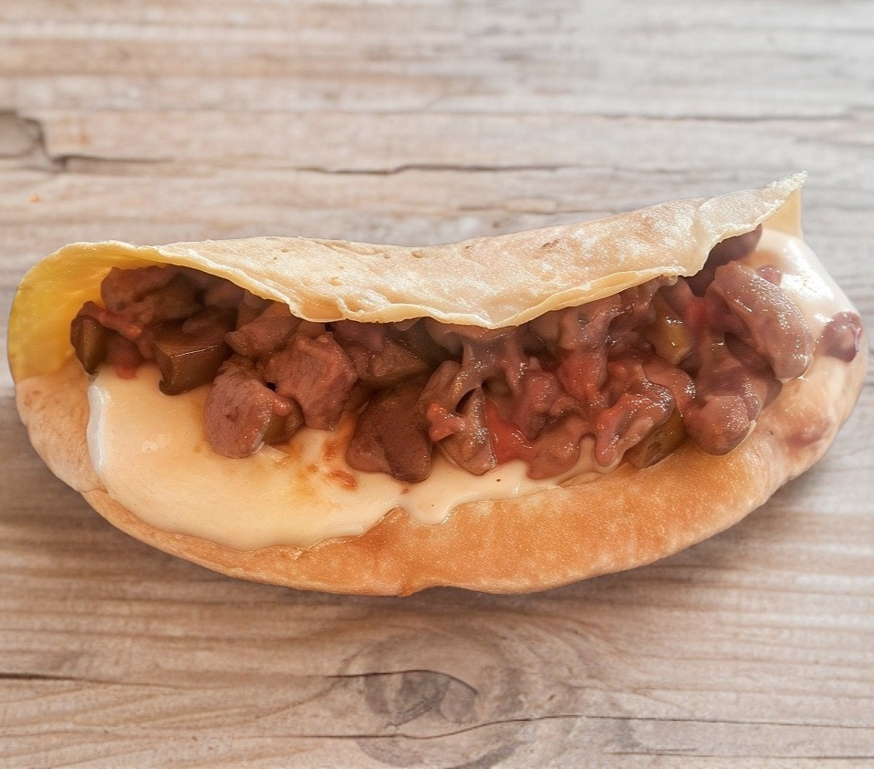 Tortilla de harina con carne árabe y queso.