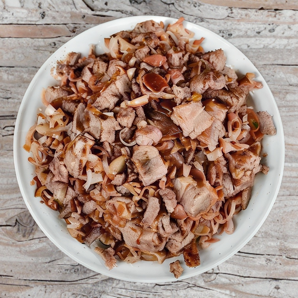 Pimiento morrón, cebolla, tocino y chuleta.