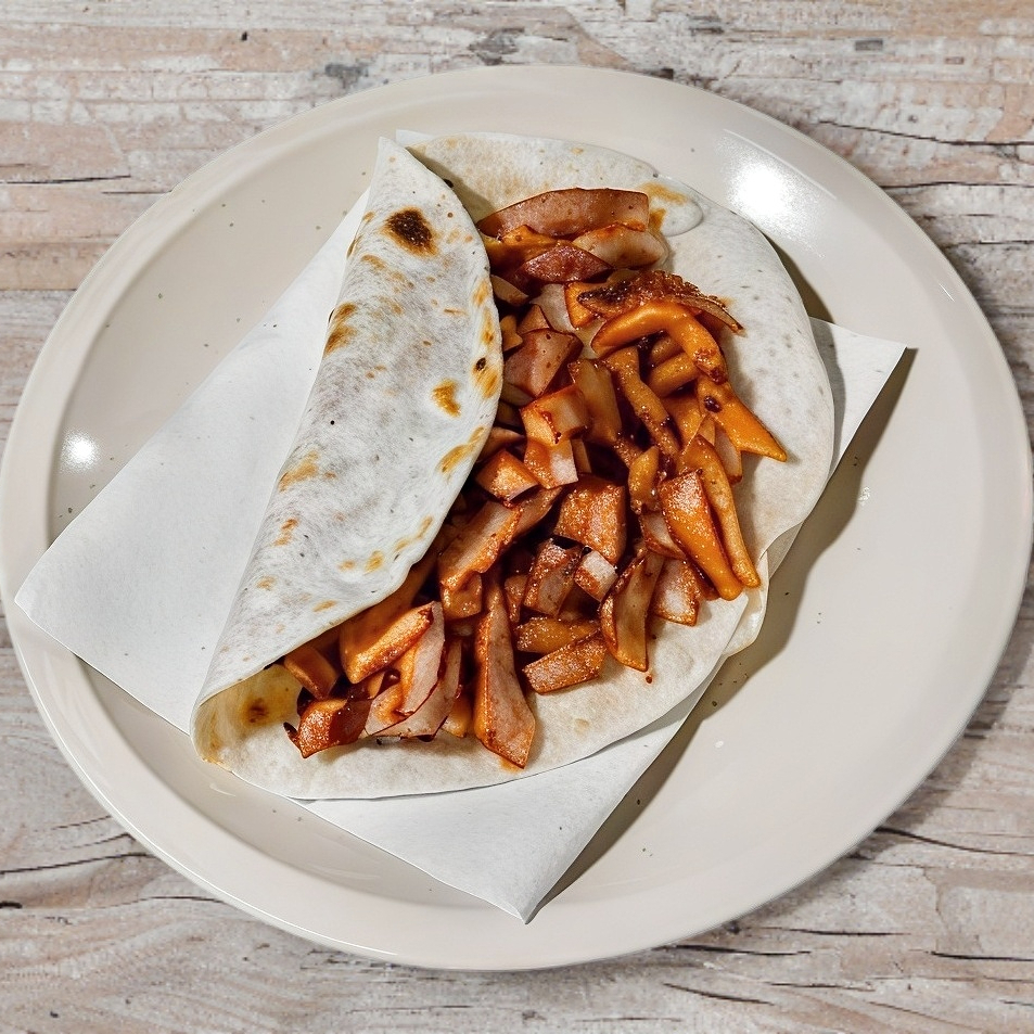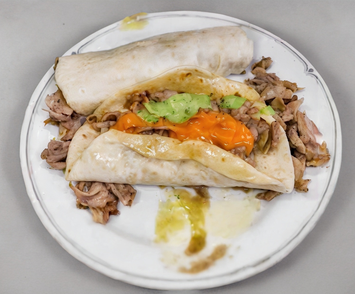 Tortilla de harina con carne al pastor y queso.