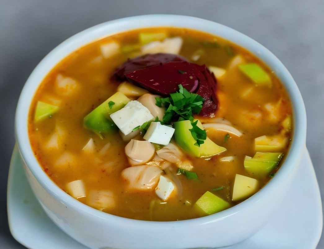 Caldo de pollo con salsa de chipotle, arroz rojo, aguacate, pechuga desmenuzada y queso oaxaca.