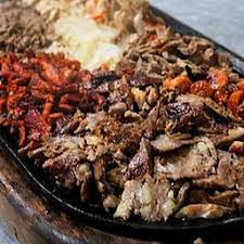 Delicioso bistec de res, adobada, chuleta, chorizo y carne árabe con queso al centro. Todo sobre una base de pimiento y cebolla. Guarnición de nopalitos y cebollitas asadas.