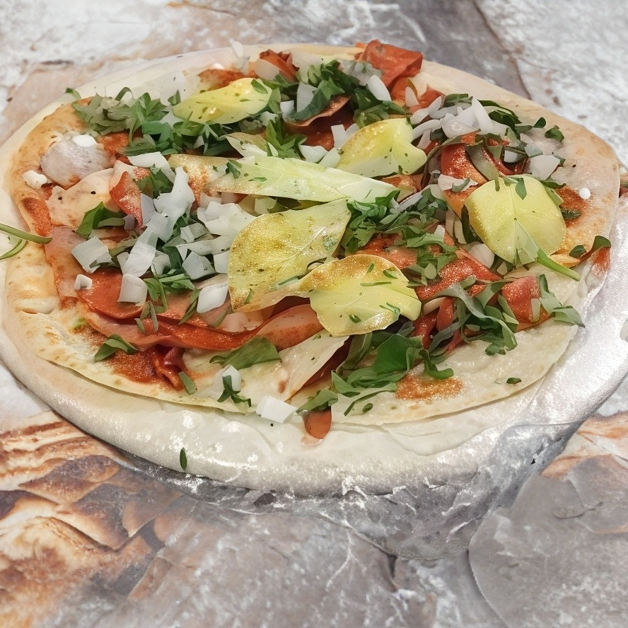 Pimiento morrón, cebolla, tocino, chuleta y queso.