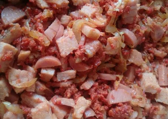 Chuleta, tocino, chorizo, jamón, pimiento morrón, cebolla y queso.