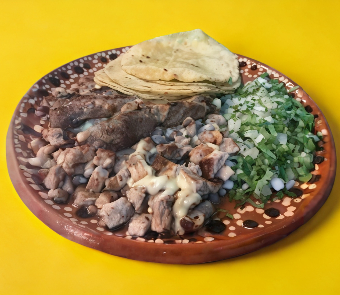 Bistec, chuleta, costilla, pastor, jamón, tocino, chorizo, pimiento morrón, cebolla y queso.