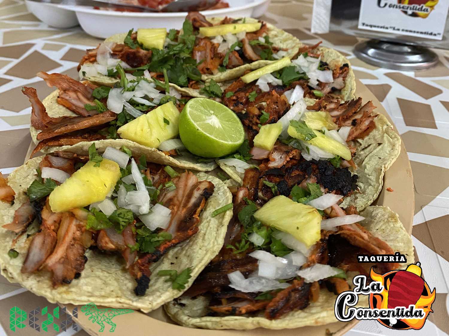 Carne árabe, cilantro, cebolla, piña, queso, frijoles.