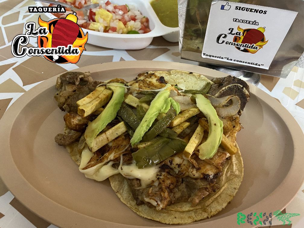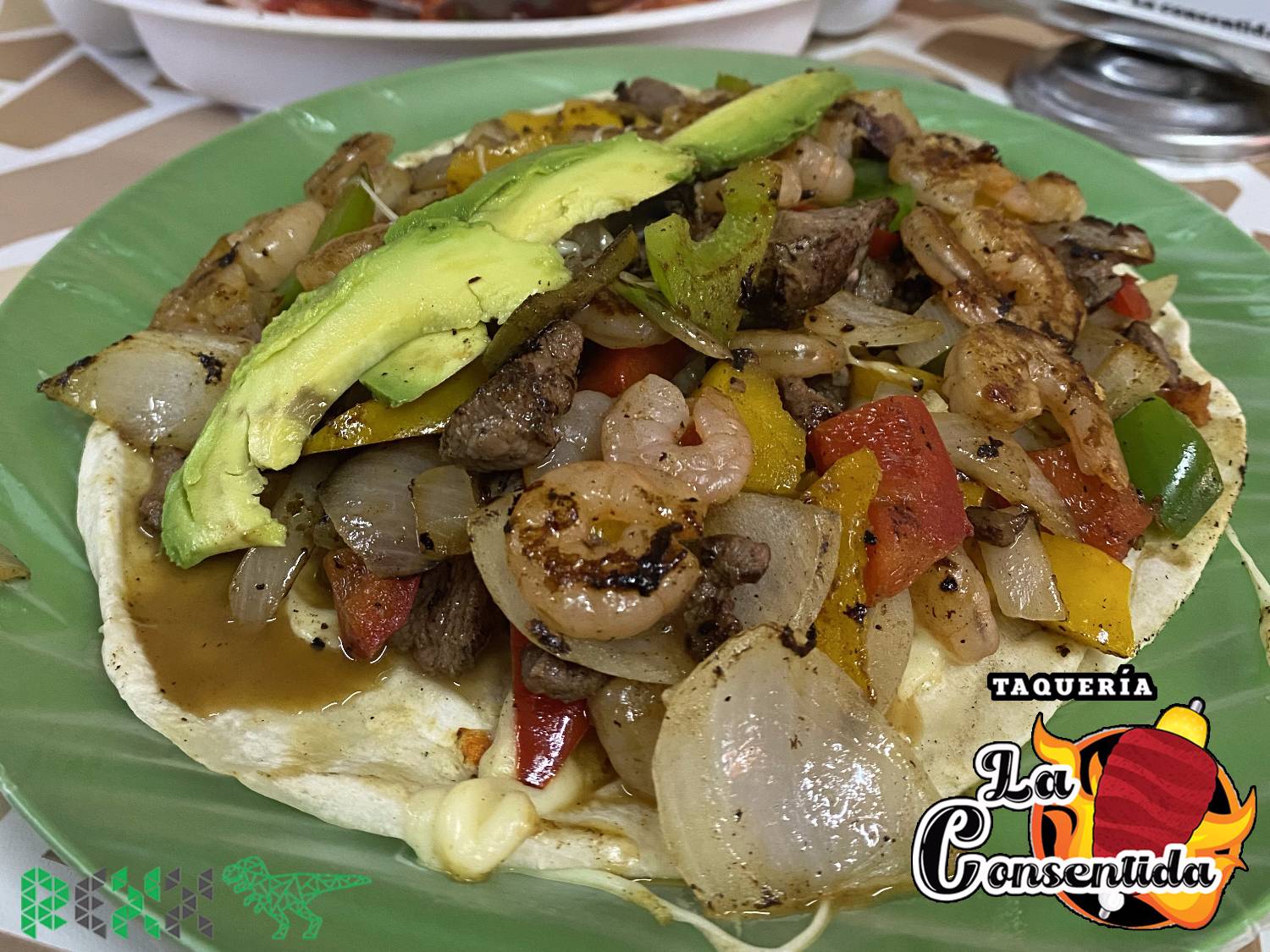 Camarón, arrachera, pimiento, cebolla, queso y tortilla de harina.