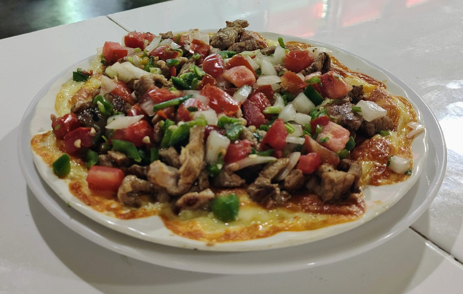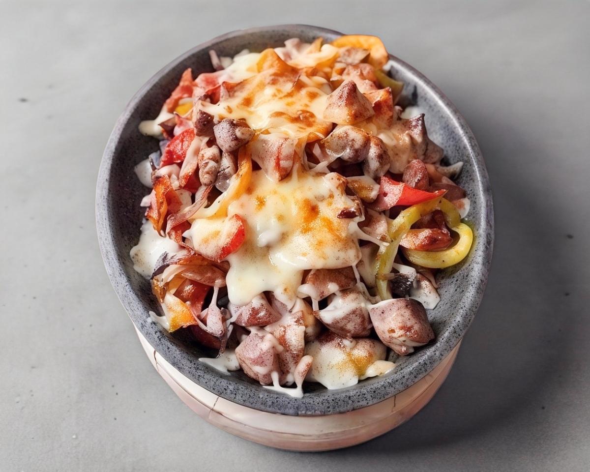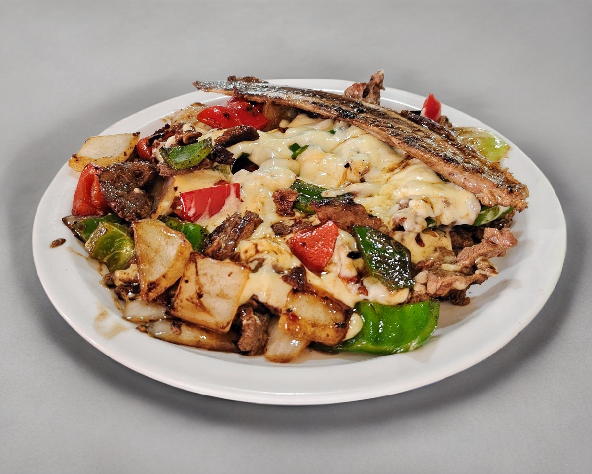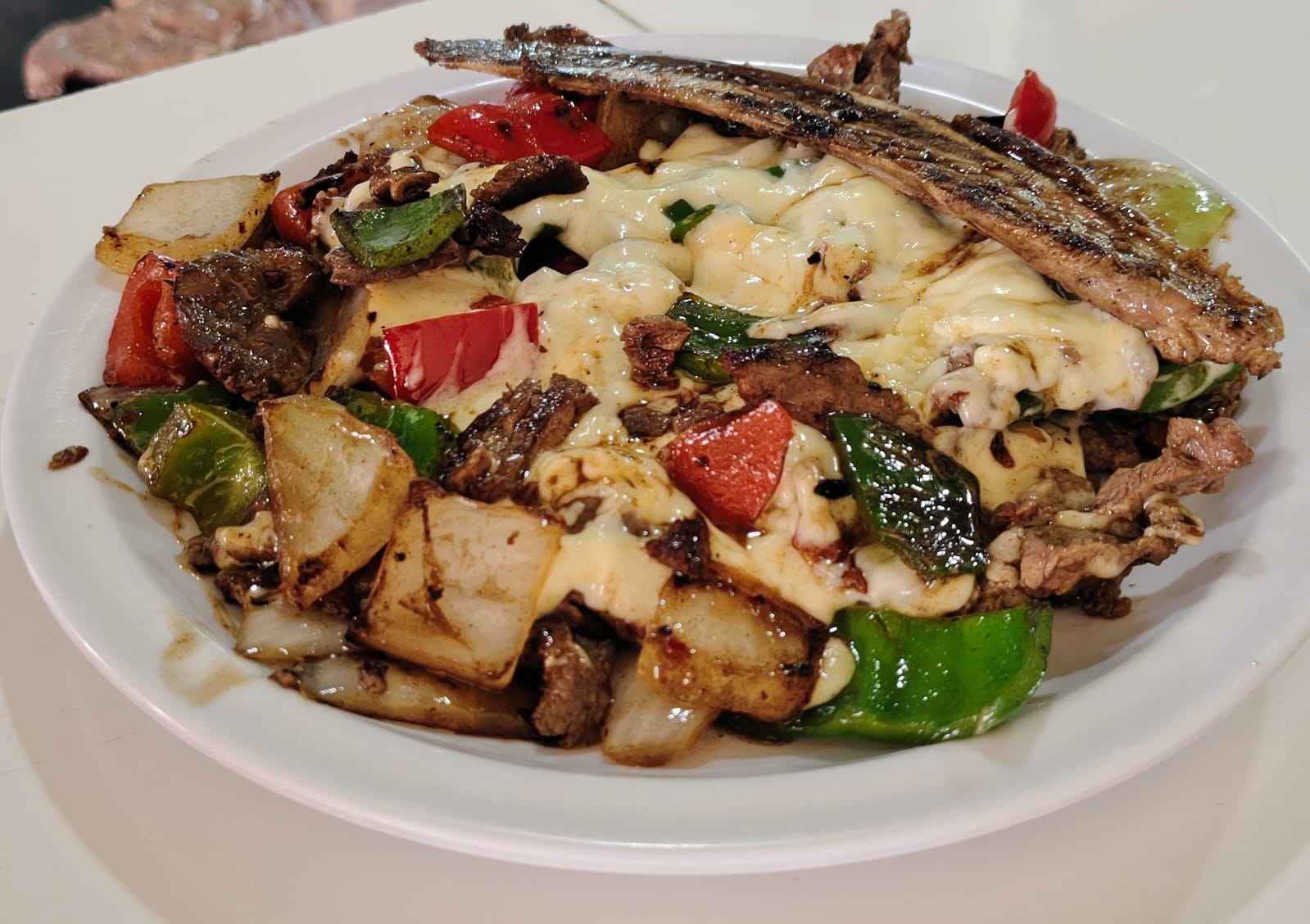Mezcla de arrachera con pimientos, cebolla, tocino y queso.