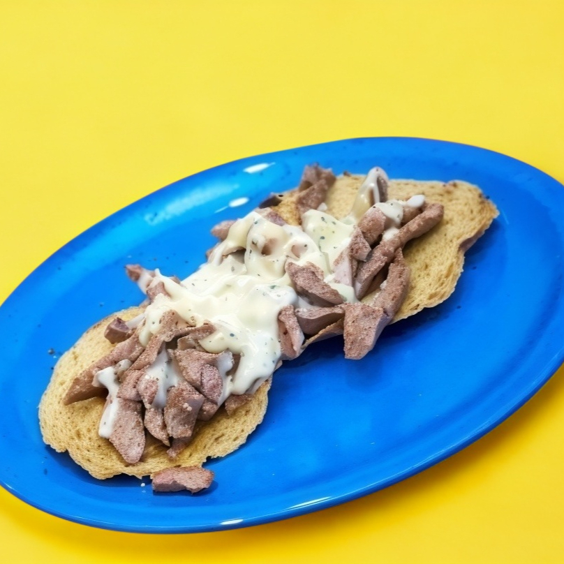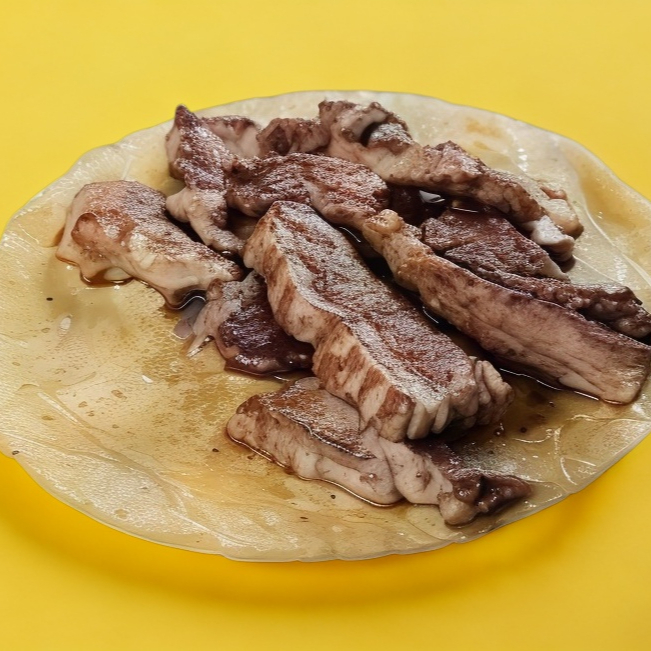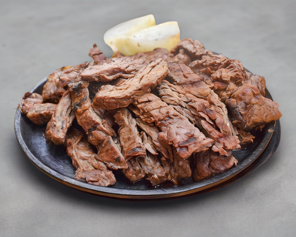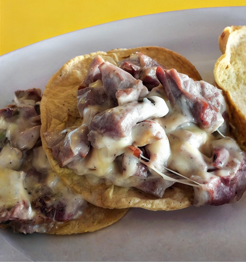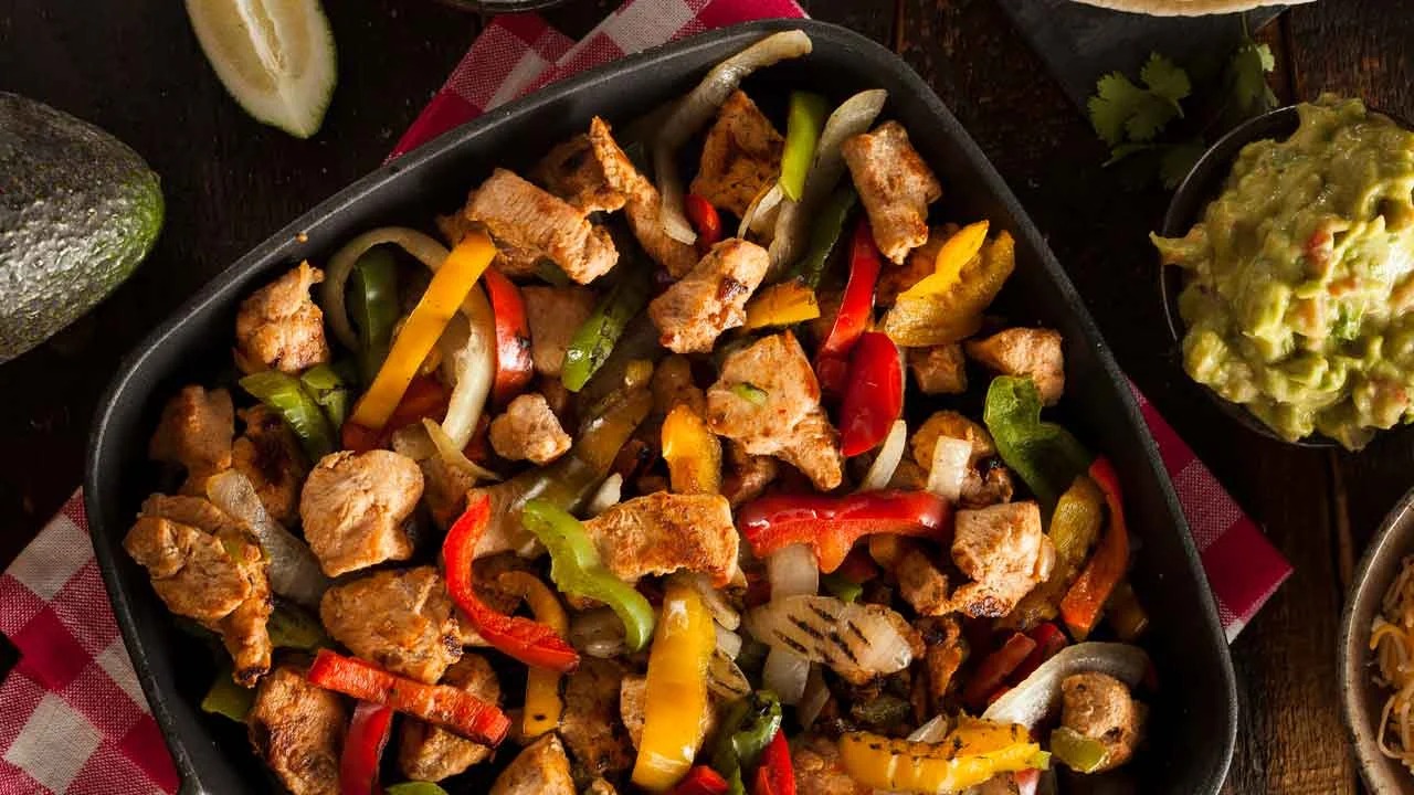 Mezcla de arrachera con pimientos, cebolla, tocino y queso.