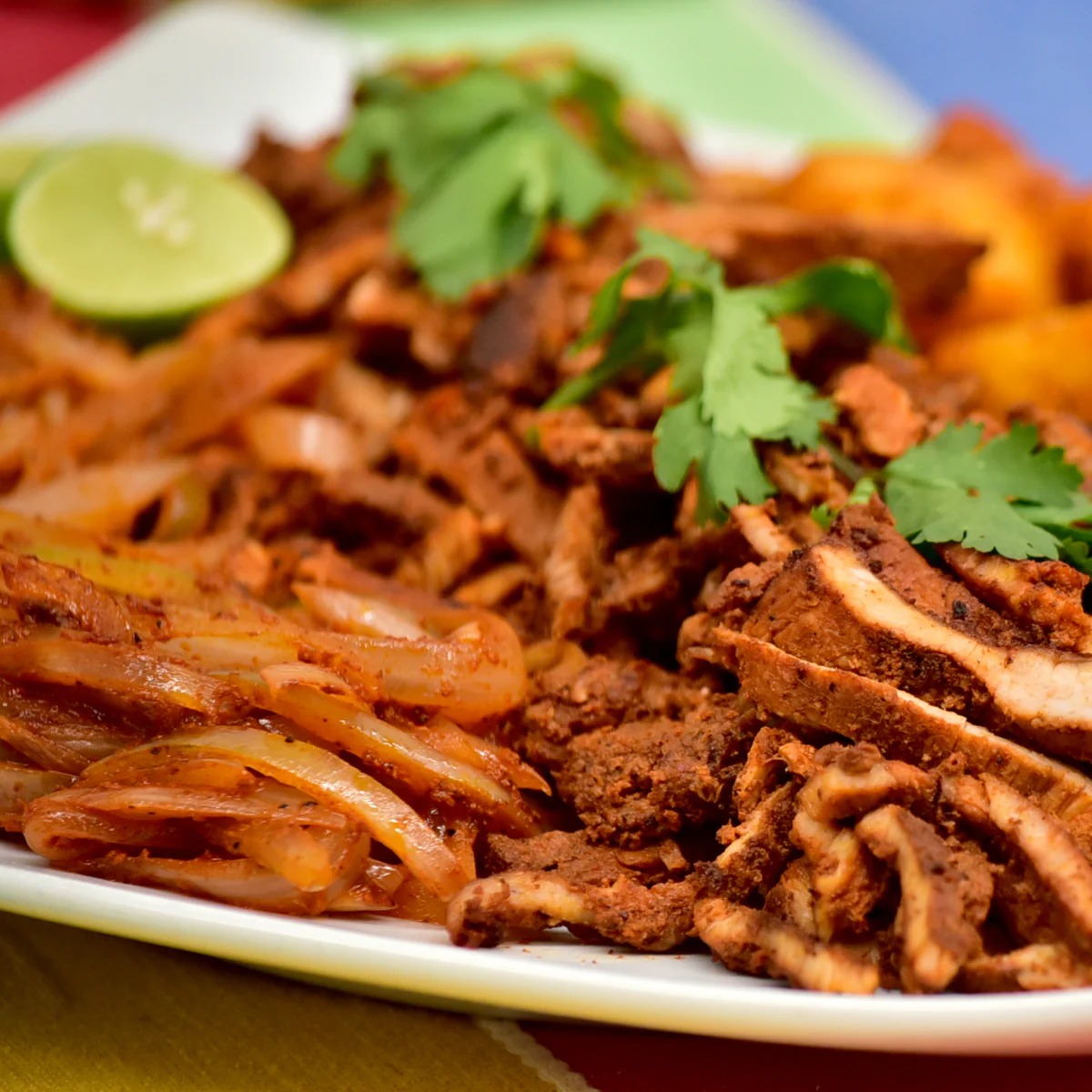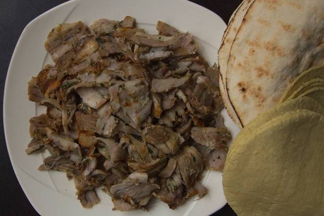 1 kg De carne al pastor. Incluye tortillas, salsa roja y verde, limones y verdura.