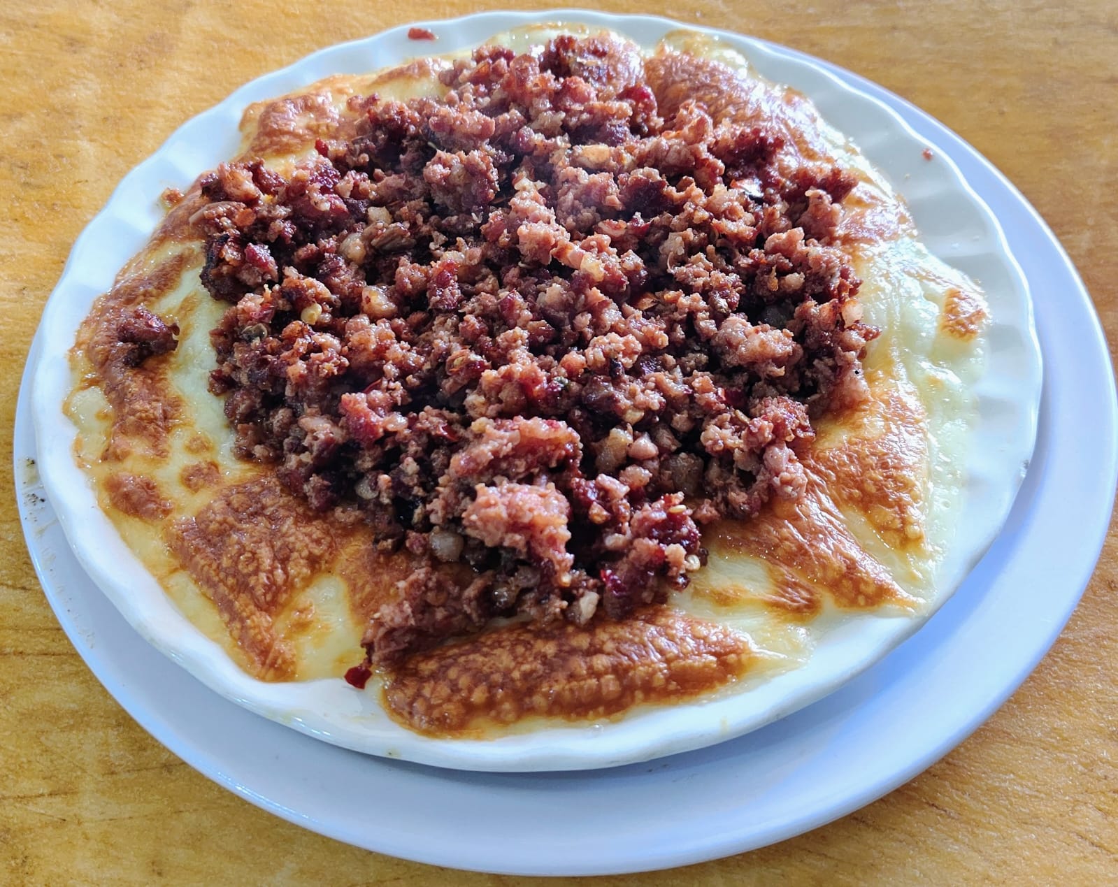 Chile morrón, cebolla, tocino, queso y carne de su elección.