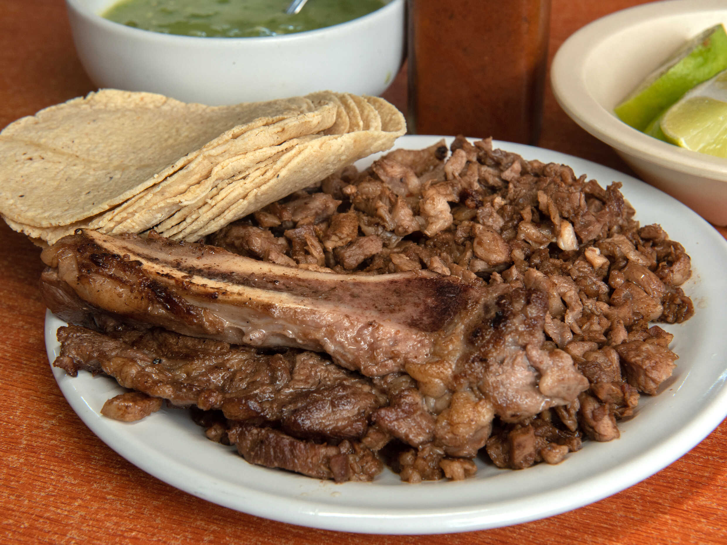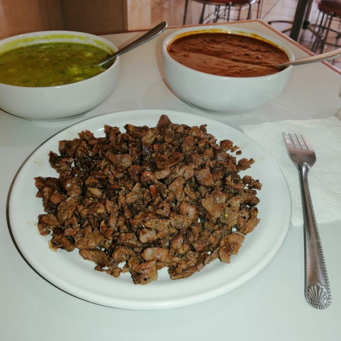 5 tacos con 70gr de carne cada uno, verdura, cebolla y cilantro. Acompañado de una bebida refrescante a elección de 350-355ml