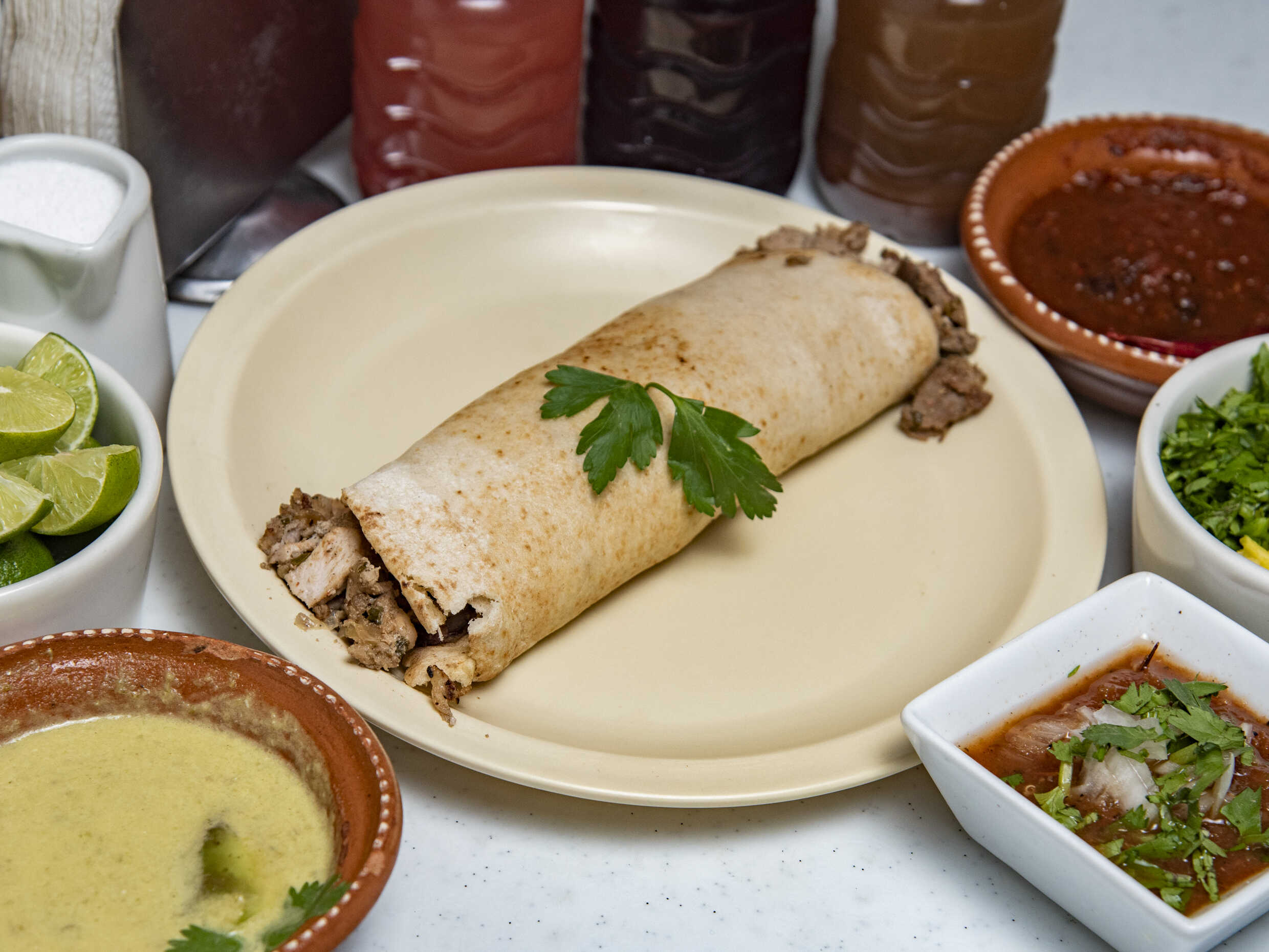 Un burrito gigante con la carne de tu elección (pastor, arrachera, bistec o lo que más te guste), acompañado de una costra de queso dorada que le da un sabor irresistible. Llevando lechuga fresca, frijoles y un toque de salsas si lo prefieres, todo perfectamente envuelto en una tortilla de harina gigante.