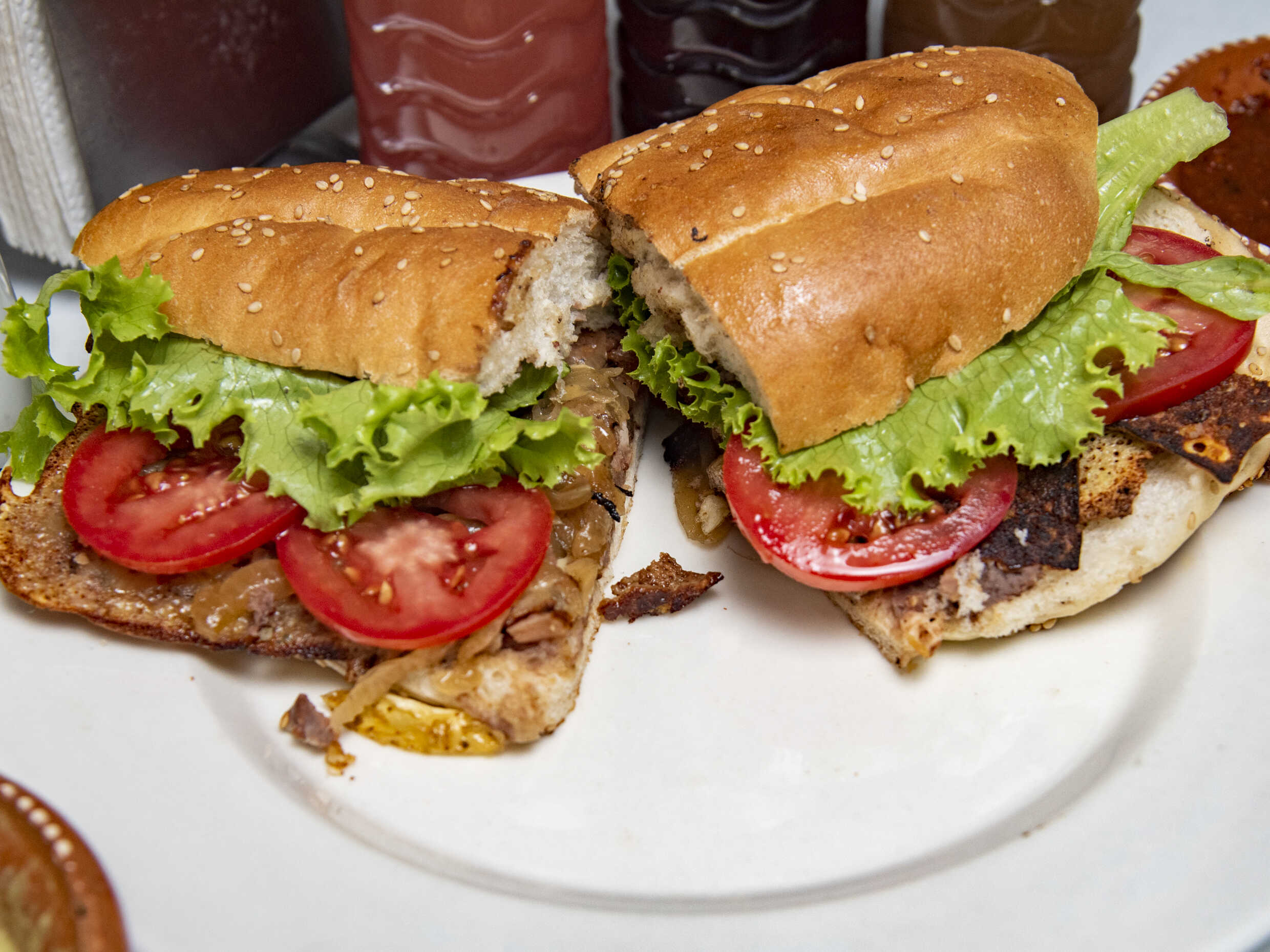 Telera tradicional con 150 gr carne, una costra de queso, jitomate, aguacate, cebolla, lechuga y fijolitos (incluye verdura y salsas)